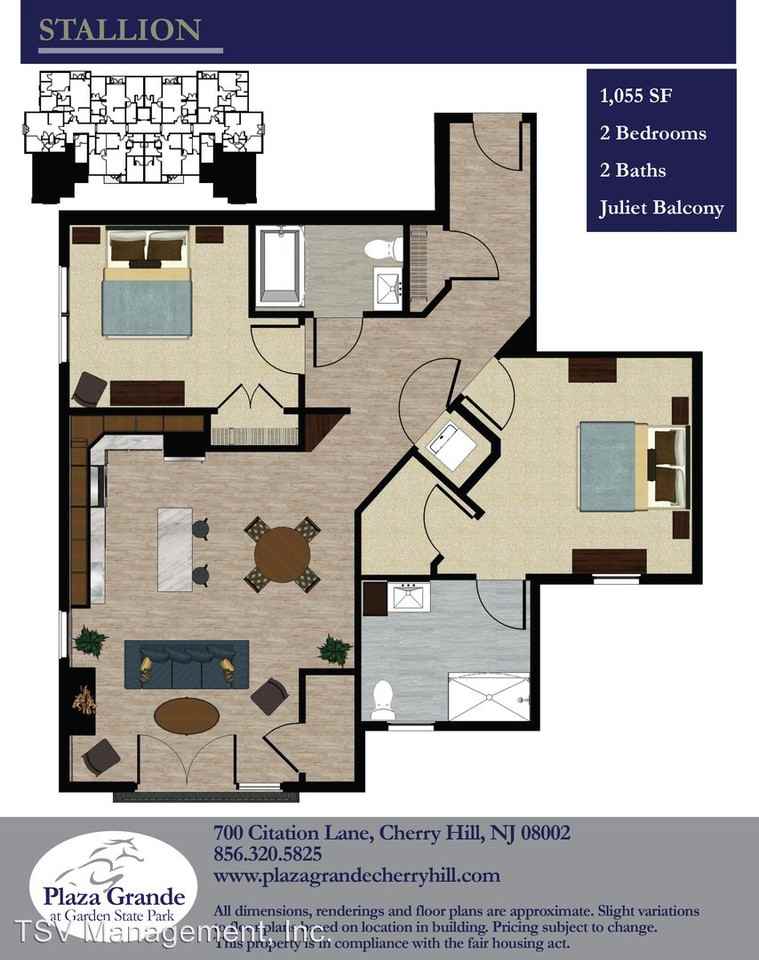 | 521 Garden Park Boulevard Stallion | 2 bed | 2 bath | 1,055 sqft | The Plaza Grande at Garden State Park - A fun-filled, country club lifestyle awaits you at the Plaza Grande. An array of amenities are provided including a private 18,500 Square Foot clubhouse with an indoor swimming pool, sauna, hot tub, fitness center with yoga studio, great room with fire place, lounge with Tv's, bililards and card tables, and a movie theater. There are extensive walking trails, private garages and so much more. You will be provided with the ease of maintenance and all of the best an active adult community has to offer. The Plaza Grande sites atop what was once Garden State Park Race. The popularity of the racetrack spawned the growth of Cherry Hill and became a crucial part of what developed into the Golden Triangle. Plaza Grande is conveniently located in the heart of Cherry Hill between Route 70 and Route 38 with all of the world class shopping at the Cherry Hill Mall and convenience of numerous grocery stores We offer many one and two bedroom floor plans, all with nine foot ceiling. Many of our apartments include private balconies and or Juliet balconies. All of our apartments have spacious walk-in closets, gourmet kitchens including stainless steel appliances and granite counter tops. Full size washer and dryer are in every apartment. private garage parking available, private storage available, pet-friendly atmosphere. | ||