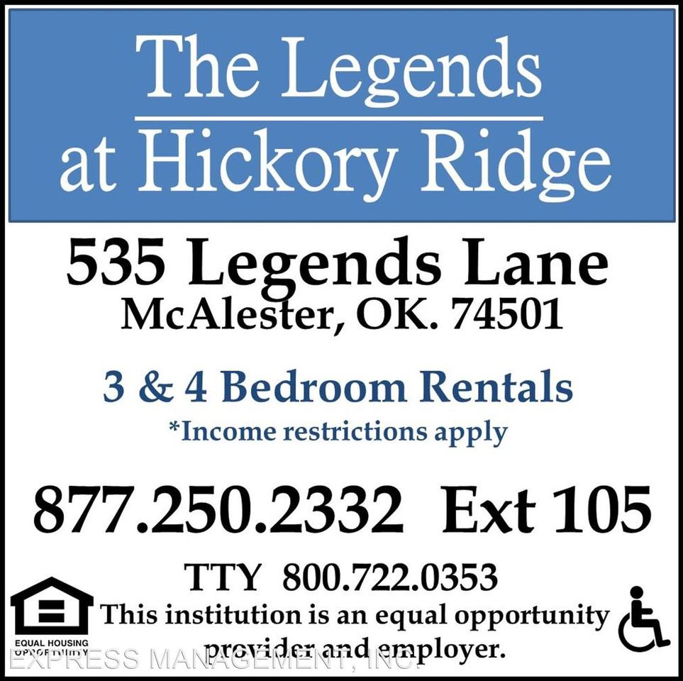 | 534 Legends Lane | 3 bed | 2 bath | 1,150 sqft | New 3 bedroom, 2 bathroom, 2 car garage - Wide open spaces! Very nice 3 bedroom, 2 bathroom, 2 car garage duplex! Total electric home featuring double pane windows, a utility room with washer/dryer hookups and laminate wood floors throughout! Enjoy the large living area and fully equipped kitchen with ice maker, dishwasher, vent hood, stove, garbage disposal and a LARGE pantry! A breakfast bar separates your kitchen and dining area. Large master suite with walk-in closet and full bath! This home includes another full bath down the hall and two more good sized rooms. The patio and outside storage are an added bonus! As a resident you will also enjoy use of the community room for parties or gatherings and two playgrounds the kids will love. This home is located in Legends of Hickory Ridge, a community you will be proud to call home! Come see for yourself. Call TODAY to schedule a tour of your new home!!! For more information and details on income restrictions call (918) 302-9545 or TTY 800-722-0353 This institution is an equal opportunity provider and employer | ||