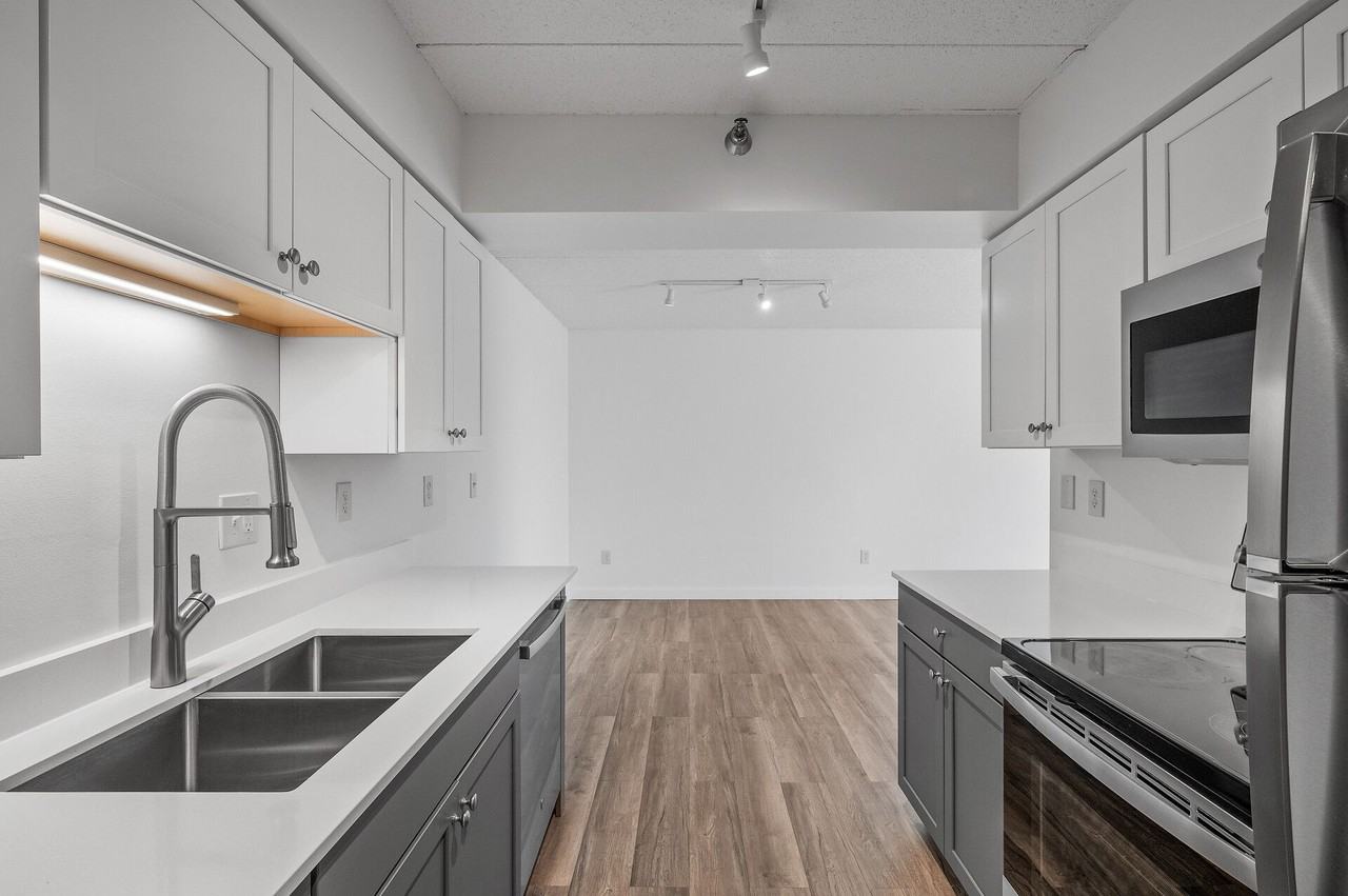 Remodeled from floor to ceiling with new premium LVT flooring, modern kitchen cabinets with stone counter-tops, stainless steel appliances including a dishwasher, designer track lighting throughout and much more! Oversized closets for bountiful storage, plenty of light from large picture window in living room, plus premium shades for privacy.