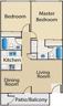 | Diamond | 2 bed | 2 bath | 888 sqft | 2 bedroom, 2 bath with private patio or balcony, large master suite, spacious living and dining area! (This is a virtual rendering of our floor plans and do not depict actual furnishings and appliances). |
