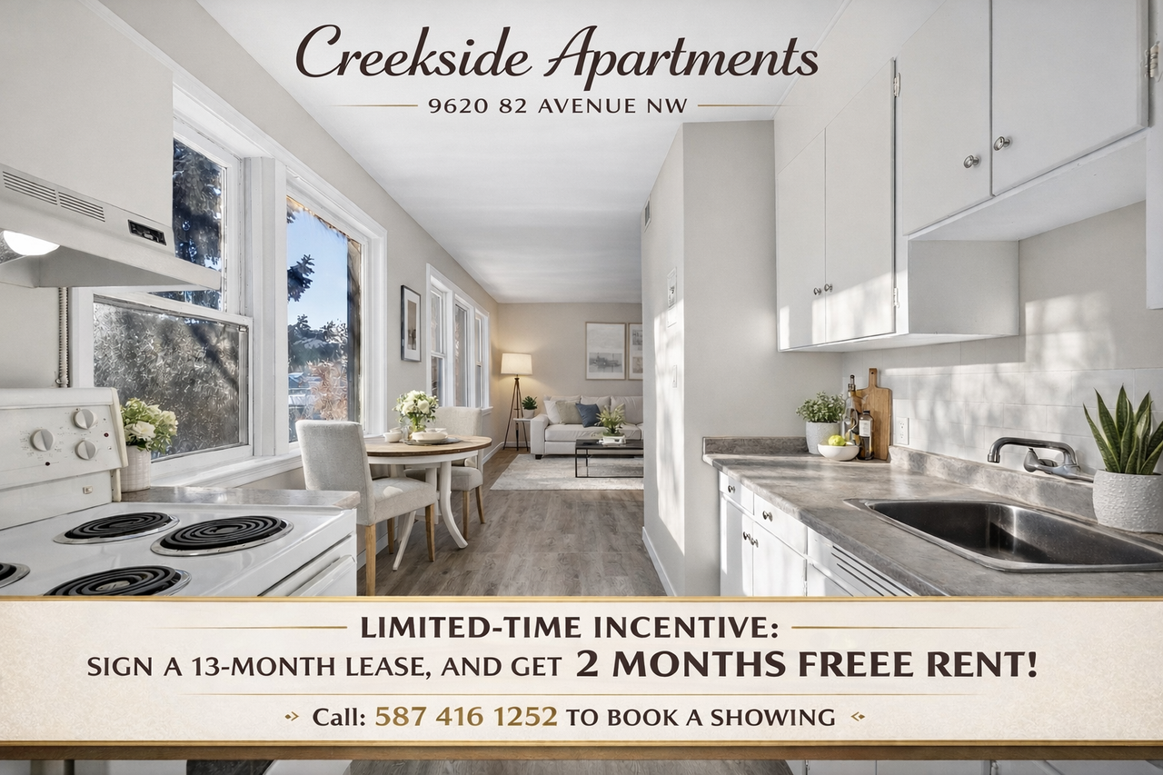 Welcome to Creekside Apartments! Limited-Time Incentive: Sign a 13-month lease and receive 2 MONTHS FREE RENT! (Free rent incentive applied to the 2nd and final months of the lease) Please click on the photos for each suite type to view actual images of the available units. Amenities & Features - Recently renovated and upgraded suites available - Modern laminate flooring - Pet-friendly community – cats and small dogs welcome - Heat and water included - Affordable surface parking – $25/month - Bright, spacious living areas with functional layouts - Suites equipped with essential appliances, including stove and fridge - Professional maintenance team with emergency line available - Shared laundry facilities conveniently located in the building - Clean, professionally maintained common areas - Tenant referral program – refer a friend and enjoy rewards! - Exclusive 25% discount on TELUS services, including high-speed internet, TV, and home phone Neighborhood Creekside Apartments is ideally located in one of Edmonton’s most vibrant and walkable areas. - Situated just off Whyte Avenue, offering quick access to cafés, restaurants, boutiques, and local nightlife - Close to Mill Creek Ravine, perfect for walking, biking, and outdoor recreation - Easy access to major bus routes and transit connections - Minutes from the University of Alberta, downtown Edmonton, and river valley trails - Nearby grocery stores, fitness studios, and everyday conveniences - A lively yet residential neighborhood with a strong community feel About the Property Creekside Apartments offers comfortable, well-maintained living in a highly sought-after south-central Edmonton location. With upgraded interiors, bright layouts, and a pet-friendly atmosphere, the property provides an ideal balance of convenience and lifestyle. Whether you’re commuting downtown, studying nearby, or enjoying the energy of Whyte Avenue, Creekside Apartments places you right where you want to be. Take advantage of our limited-time 13-month lease incentive and make Creekside Apartments your next home! Professionally Managed by MyVic Property Management Book a showing Call: 587 416 1252