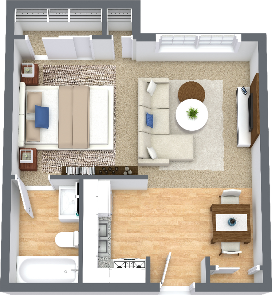 | S1 | Studio | 1 bath | 433 sqft | $715 /mo | 3 units available | Welcome to our Studio Apartment on the first floor in Lawrence, KS. This 1st floor studio apartment offers a unique and open floor plan, perfect for those seeking a cozy and functional living space. The open kitchen is equipped with all electric appliances, making meal preparation a breeze. The separate dining room provides a designated space for enjoying meals or entertaining guests. With a picture window in the living area, natural light floods the space, creating a warm and inviting atmosphere. The large bedroom area features a double floor-to-ceiling closet with built-in shelves, providing ample storage for all your belongings. The spacious bathroom includes a full-size bathtub/shower, ensuring relaxation after a long day. Our apartment is pet-friendly, with no breed restrictions or weight limits, so your furry friends are welcome to join you. Enjoy the convenience of our resident portal phone app and online rental payments, making managing your living experience a breeze. Our on-site management team is available to assist you, along with 24-hour emergency maintenance and after-hours security patrol for your peace of mind. Stay active and fit in our fitness center, complete with an enclosed yoga studio, or take advantage of our resident center with free WIFI. Enjoy outdoor activities with our basketball court and swimming pool, perfect for those warm summer days. Community laundry facilities are available for your convenience. Our location offers close access to I-70 Highway, shopping, and dining options. We are just 10 minutes away from downtown Lawrence and the KU campus, making commuting a breeze. Nearby parks provide opportunities for outdoor recreation, and an on-site bus route ensures easy transportation. Come and experience comfortable living in our Studio Apartment on the first floor. | |