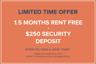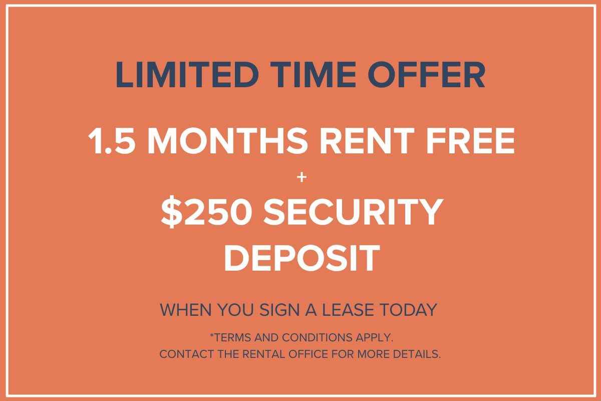 1.5 Months Rent Free + $250 Security Deposit Move in this month and you may qualify for our incentive.