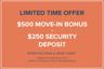 $500 Move-In Bonus + $250 Security Deposit Move in this month and you may qualify for our incentive.