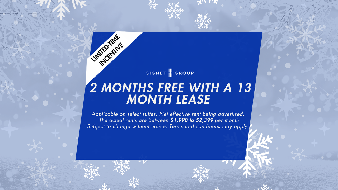 *Limited time offer : Get 2 month free on a 13 month lease ! Net effective rent being advertised. The actual rents are between $1,990 to $2,399/month. Promotional offer based on a 13-month lease with 2 months free. Subject to change without notice. Terms and conditions may apply.