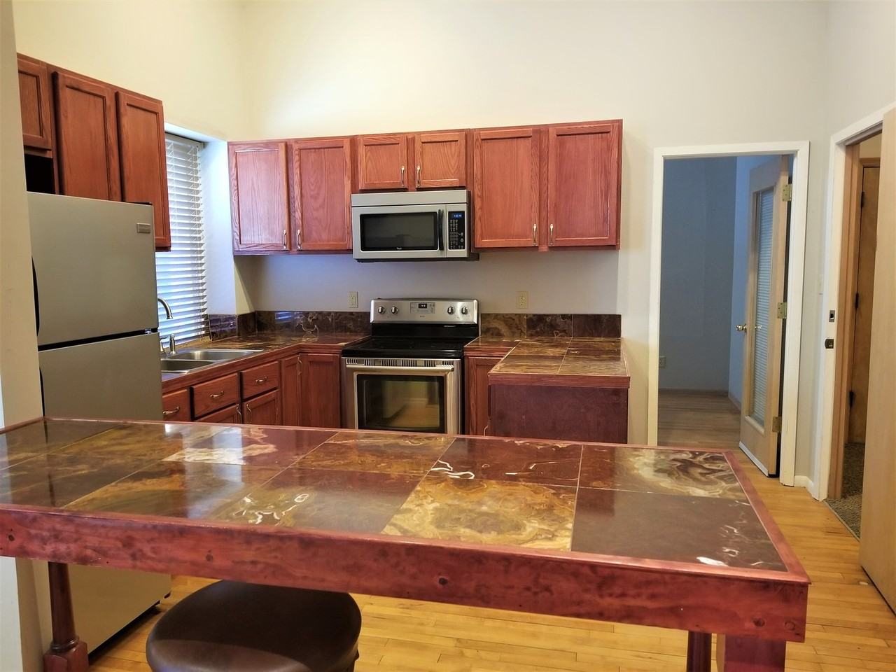 Exquisite Finishes in lovely two bedroom / one bathroom apartment one block from square, extensive upgrades with bamboo floors, beautiful kitchen with burgundy marble counters, breakfast bar, master suite, $849 month plus $260 flat rate for utilities.