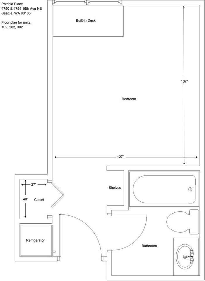 | Studio Bedroom 1st Floor | 1 bed | 1 bath | 120 sqft | $1,050 /mo | 2 units available | Schedule a Tour: https calendly com udistricthousing tour Contact us today! 206-953-0033 (Property Manager) https udistricthousing com properties 4754 php Features: Intercom entry Full private bathroom with tub/shower in each room Units have built in desk Individual mid-size refrigerators in each studio room Shared kitchen on each floor On-site laundry facilities Free WiFi (Fiber) Easy bus access Resident garage parking is available for $100 per month We require first / last month rent, $400 security deposit and application fee |