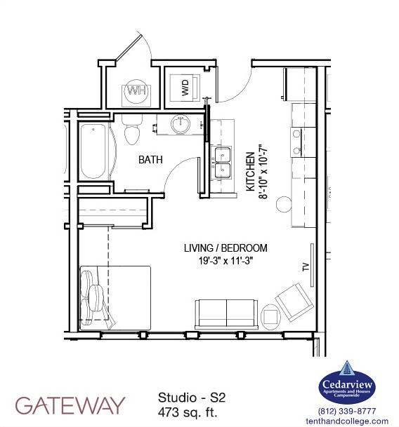 Studio apartments at The Gateway Apartments cost about 2% more than the average rent price for studios in Bloomington.