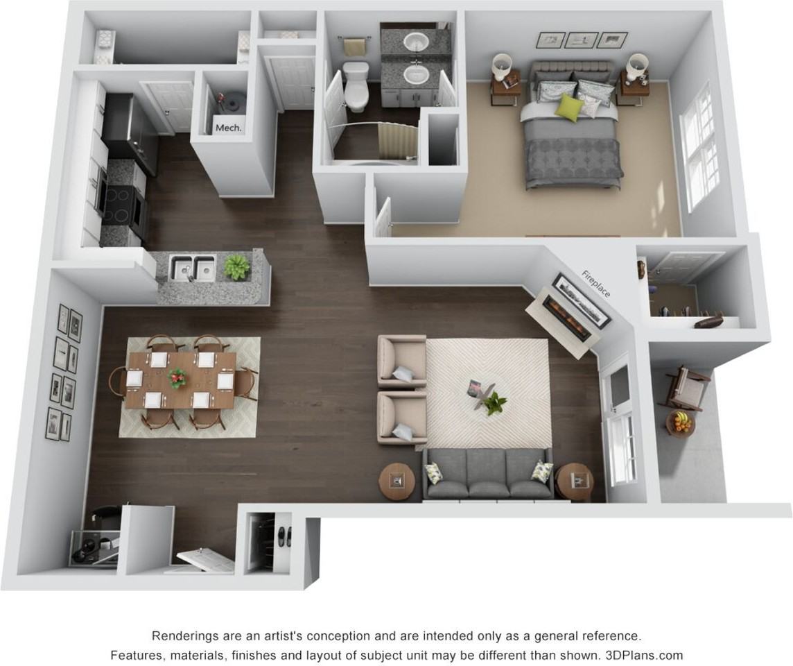The Andes Classic floorplan is an 854 square foot, 1-bedroom, 1-bath apartment with a patio or balcony depending on the floor level. Our Classic finish package includes: • White cabinets • White appliances • Laminate countertops • Ceiling fans in the bedrooms and living room • Full sized washer and dryer connections • Gas fireplace in the living room • Built in desk area *Our units have high quality hardwood-inspired flooring and plush carpets. Depending on what floor of the building the unit is on there is more or less carpet. Bottom floor units have carpet only in the bedrooms, upper levels have carpet throughout with the vinyl in the kitchen/bathrooms.