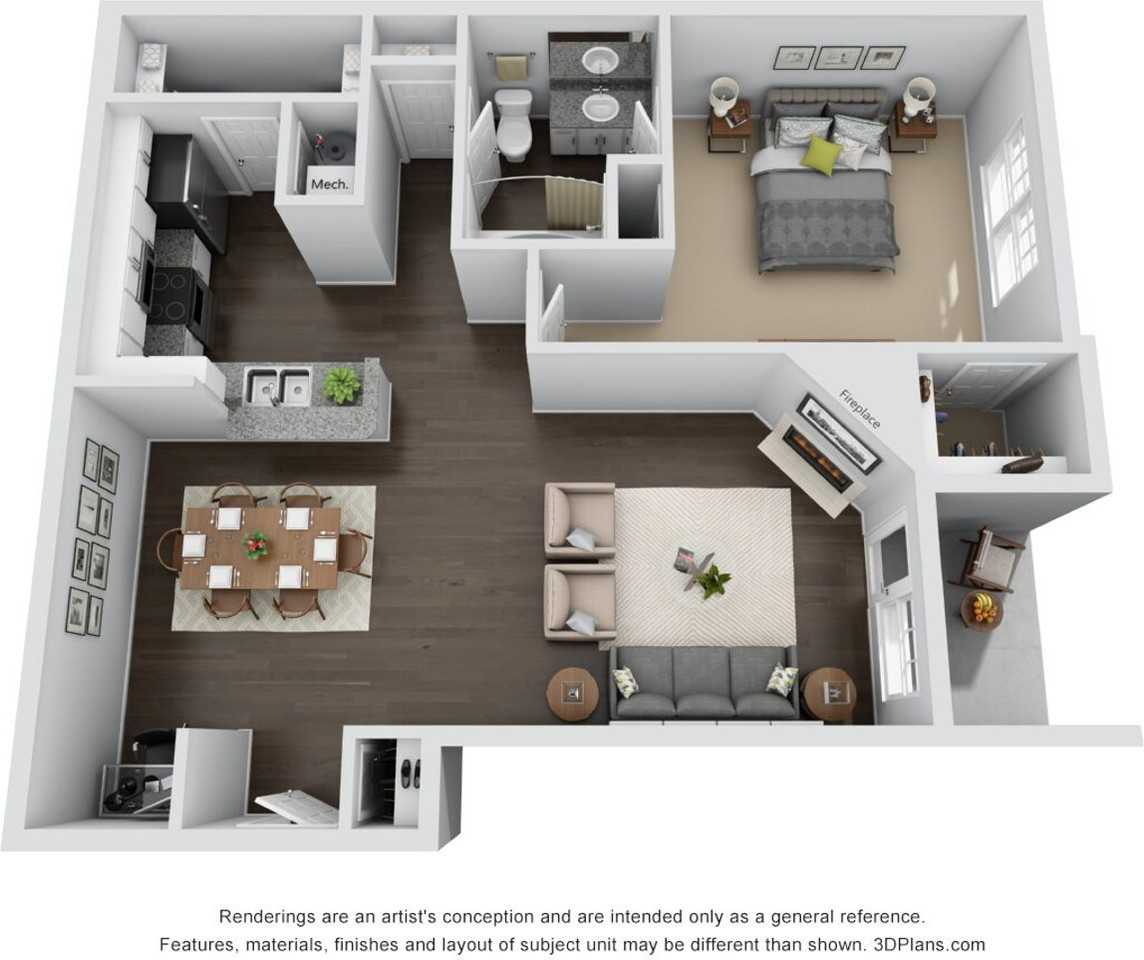 Our Andes Elite floorplan is an 854 square foot 1-bedroom, 1-bathroom apartment with a patio or balcony depending on the floor level. Our Elite finish package includes: • Updated shaker style, soft close, white cabinets • Granite countertops • Tile backsplash in the kitchen • Ceiling fans in the bedrooms and living room • Full sized washer and dryer connections • Gas fireplace in the living room • Built in desk area *Our units have high quality hardwood inspired flooring and plush carpets. Depending on what floor of the building the unit is on there is more or less carpet. Bottom floor units have carpet only in the bedrooms, upper levels have carpet throughout with the vinyl in the kitchen/bathrooms.