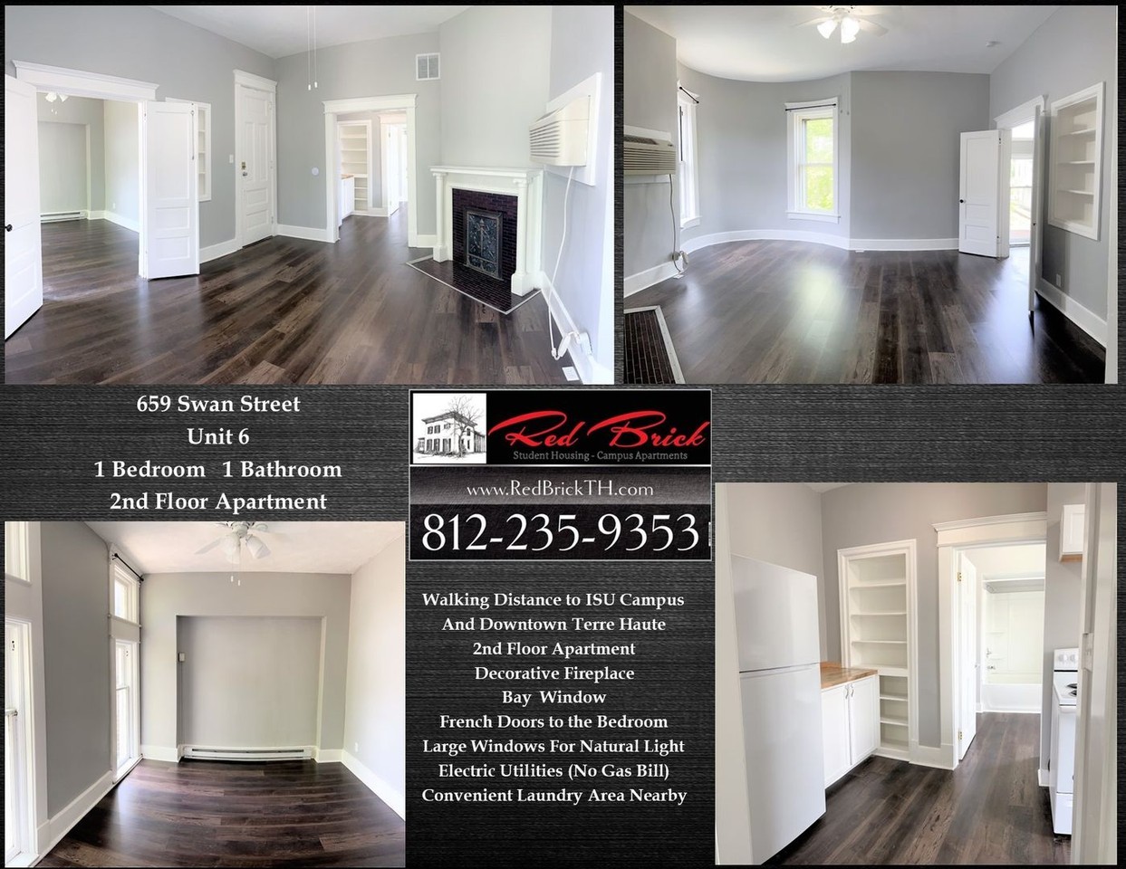 | 1BR/1.0BA | 1 bed | 1 bath | $675 /mo | 1 unit available | Now Accepting Applications for a 2nd Floor, 1 Bedroom 1 Bathroom apartment at 659 Swan Street Unit 6 Within walking distance to ISU. Available in August $675 per month ($675 Deposit) This Apartment features a decorative fireplace, built in shelving, Luxury Vinyl Plank Flooring, French doors on the bedroom, and a beautifully unique living room with a Bay Window .The bathroom has a bath/shower combo as well as a built in linen cabinet. Refrigerator/stove are provided. Special order security lock/key system implemented, Convenient Tenant laundry area nearby Tenant is Responsible for Electric Utilities. Landlord Pays the Water/Sewage/Trash services. Renter's Insurance is Required. Background/credit check Required ($25 application fee per applicant) due upon applying for the apartment Please contact our office at 812-235-9353 if you have any questions or if you would like to inquire about the availability status of this apartment. |