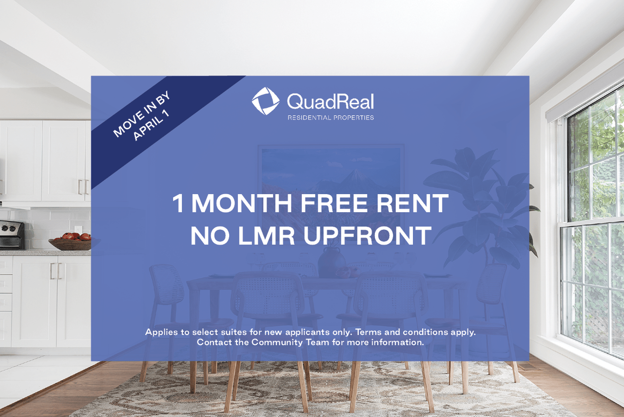 1 Month Free Rent Applies to select suites for new applicants only. Terms and conditions apply. Contact the Community Team for more information.