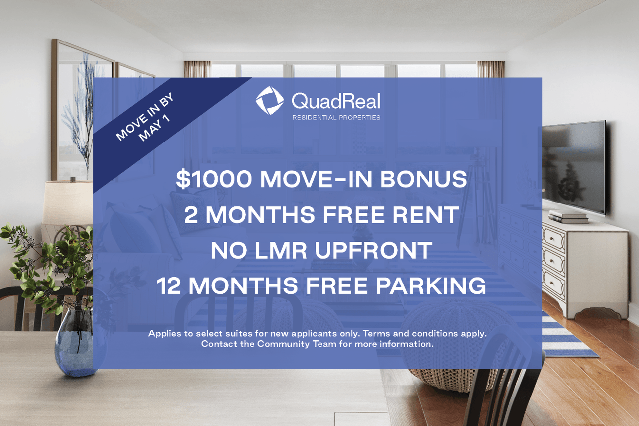 2 Months Free Rent Applies to select suites for new applicants only. Terms and conditions apply. Contact the Community Team for more information.