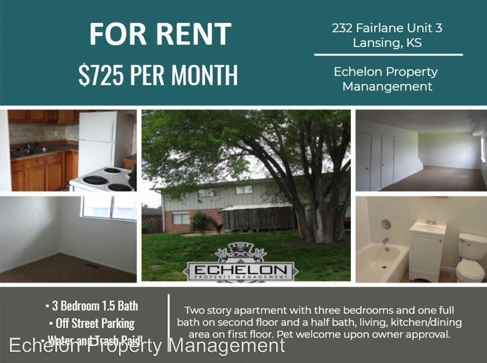 | 232 Fairlane - Unit 3 | 3 bed | 1.5 bath | Lansing Apartment 3 Bedroom with 1.5 Baths - Each unit is two stories with three bedrooms and one full bath on second floor and a half bath, living, kitchen/dining area on first floor. Pet upon approval. Professionally managed by Echelon Property Management at 913-705-0201 or visit www EchelonKS com |