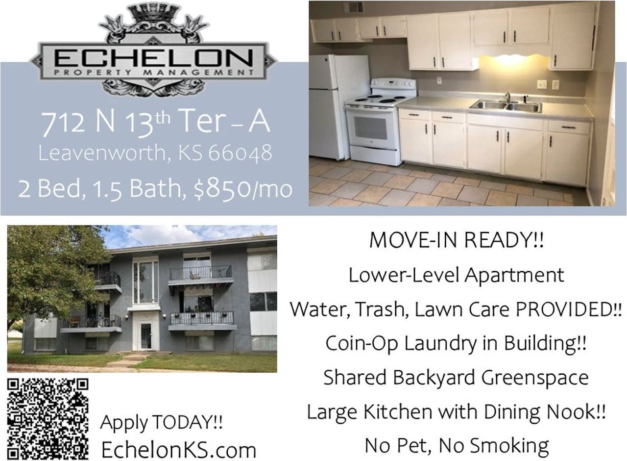 Lower Level, Move-In Ready Apartment, 2 Bed, 1.5 Bath!! Kitchen includes a Dining Nook, Fridge, Oven/Range. Tile Floors throughout!! Minutes away from Fort Leavenworth, Downtown Leavenworth, Lansing, and the Greater Kansas City Area. Coin-operated laundry room in building common area. Water, Trash, and Lawn Services PROVIDED!! No Pet. No Smoking. Shared greenspace backyard!! Apply NOW!! EchelonKS. com Professionally managed by Echelon Property Management, 913-705-0201. Rental qualifications: Credit score of at least 600, no evictions within the past 7 years, at least 90 days verifiable income, monthly income of at least 3 times the rent, at least 18 years of age.