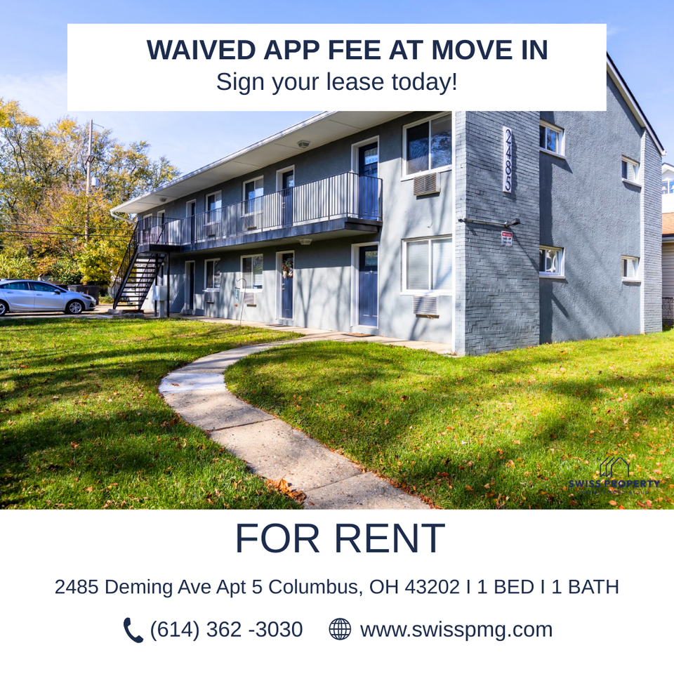 | 1BR/1.0BA | 1 bed | 1 bath | 497 sqft | $900 /mo | 1 unit available | Discover comfort, convenience, and room to breathe at 2485 Deming Ave, Apt 5 — a well-appointed 2-bedroom, 1-bath apartment in a highly accessible Columbus neighborhood. Professionally managed by Swiss Property Management Group, this home features a smart, functional layout and everyday amenities designed to support an easy, practical lifestyle. Key Features: • 1 spacious bedroom • 1 full bathroom • Great remodeled unit with new flooring • Comfortable living space in the Old North area • Off-street parking available • Walking distance to many shops and restaurants • Near the bus line for easy commuting Move-In Terms: To make the move more manageable, Last Month’s Rent can be paid in three monthly installments after move-in. Resident Benefits Package – $50/month: All residents are enrolled in the Swiss Property Management Group Resident Benefits Package, which includes liability insurance, credit-building for on-time rent payments, up to $1M identity theft protection, HVAC filter delivery (when applicable), a move-in utility concierge, a resident rewards program, on-demand pest control, and additional support services designed to enhance your rental experience. Full details are provided with the application. This home combines comfort, practicality, and exceptional value. Contact us today to schedule your tour and experience everything 2485 Deming Ave, Apt 5 has to offer. |