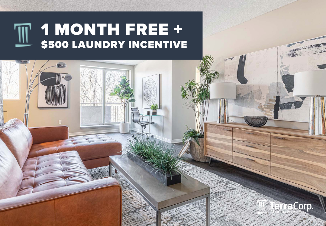 1 Month Free + $500 Laundry Incentive Offer available on select suites when you sign a 13-month lease by May 1, 2026. Select suites apply.