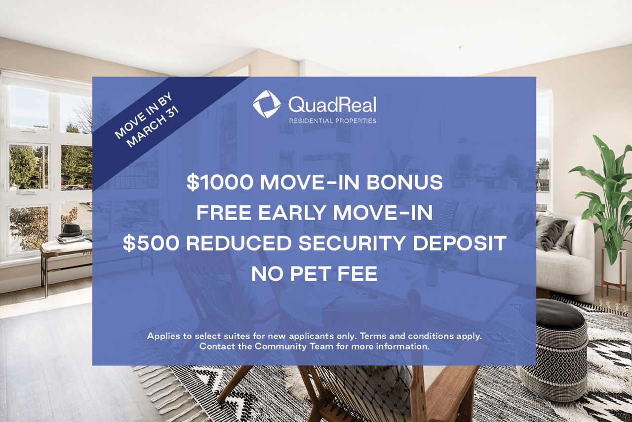 Thank you for your interest. We are offering virtual and in-person tours. Stunning rental apartments in North Vancouver Whatever you're looking for, you'll find it at Sundance Apartments. In the heart of North Vancouver, our apartments offer well designed living spaces. Venture on to Lonsdale Ave to one of the local restaurants for a delicious meal. Nearby retail coupled with modern floor plans and features make Sundance Apartments the ideal place to call home. Secure gated underground parking along with dedicated EV charging parking spaces available for rent with unlimited charging. Property Features: - QuadReal+ Home app: your QuadReal life in the palm of your hand - Outstanding location just off the Lonsdale shopping strip, with shops, services, and restaurants a short walk from your door - Excellent amenities to enjoy, including a spacious amenity room and relaxing community garden - Pet friendly community (some restrictions; additional one half month's rent deposit applies) - Secure property access by key fob with Enterphone service to allow access for your guests - Convenient access to transit via the North Vancouver bus network, with Lonsdale Quay a short ride away, and Highway 1 just a couple of blocks from the property - Assigned underground parking and storage units available ($) - Friendly and professional management. - Electric Car Charging stations Neighbourhood Enjoy the best of North Vancouver's Central Londsdale neighbourhood in a location that can't be topped. Sundance Apartments is located within walking distance of excellent local restaurants, including Cazba Restaurant and Sushi Umi. In the mornings, stop by nearby Roastmastir's Coffee for a caffeine boost. After work, enjoy a pint at local favourites Browns Social House or Jack Lonsdale's Public. North Vancouver is the proud home to a long list of neighbourhood parks, so you can enjoy regular access to beautiful green spaces, plus the mountains and trails nearby. Sundance Apartments is also conveniently located near Highway 1 and the Iron Workers Memorial Bridge for short commutes around the city and beyond. Sundance Apartments is professionally managed by QuadReal Residential Properties. * Photos are not of exact suite available or indicative of product quality and finishing. All suites are unfurnished. Prices and availability are subject to change. Please inquire for up-to-the-minute information. Our Net Zero Commitment: QuadReal is committed to net zero carbon by 2050 across its global portfolio in alignment with science-based carbon reduction goals. QuadReal’s net zero strategy builds on its original 2016 mandate to achieve an 80 per cent carbon reduction goal across its Canadian operations. Since 2016, QuadReal has demonstrated leadership in reducing carbon emissions across its Canadian portfolio and will use key learnings to accelerate and deepen its sustainability goals in both its Canadian and international assets. You can learn more about our net zero strategy at quadreal com