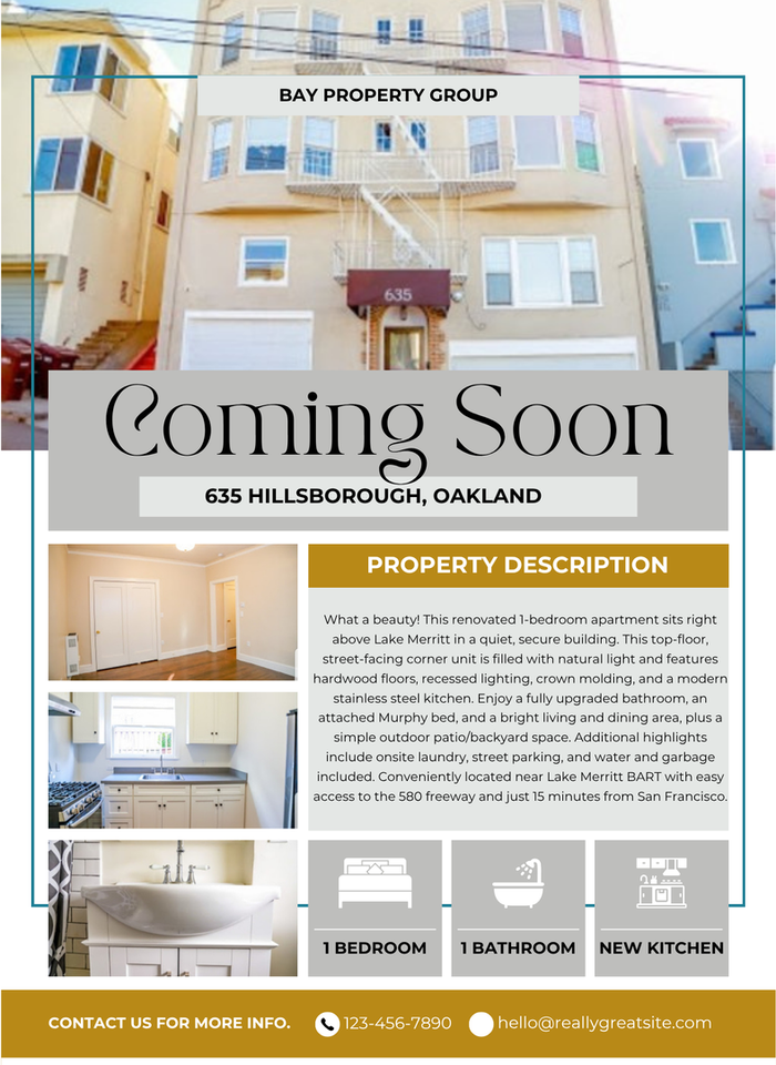 What a Beauty!!! This Renovated Apartment Is Located In A Quiet And Secure Building. This Upgraded Unit Has A Welcoming Stainless Steel Kitchen, Hardwood Flooring, Fresh Paint, New Bathroom Fixtures, (shower, tub, sink and vanity) Crown Molding Throughout Home, And Attached Murphy Bed. This Wonderful 1 Bedroom Also Features A Simple Outside Patio/ Backyard Space And Onsite Laundry. The Property Sits Right Above Lake Merritt, Centrally Located Near The Lake Merritt Bart. Access to 580 Fwy & 15 Minutes Away From San Francisco. Make This Your Home Today! Rent: TBD Deposit: $2,275.00 RENTAL FEATURES - Secured front entrance - Top floor - Street facing corner unit - Recessed lighting - Hard wood floors - Living room - Lots of Natural Light - Dining area - Stove / Oven - Refrigerator - Laundry Mat 1 block away -Owner Pays Water and Garbage -Street Parking -Pet Cat allowed; Additional $500 Deposit For questions or to schedule a showing please contact: La' Shae Alexander **** (510) 365-0575 APPLICATION REQUIREMENTS: Application Fee: $35.00 Per Adult Minimum Credit Score: 650 Documented Income: 3x Rent Gross Income Landlord References: Positive Feedback Required TO APPLY: http www baypropertygroup com vacancies *As property owner or managers, we do not discriminate in the rental of property on the basis of race, color, religion, sex, sexual orientation, handicap, familial status, or national origin. **Bay Property Group trusts that all material facts in this listing are correct but assumes no legal responsibility for its accuracy. All information is subject to change or withdrawal without further notice.