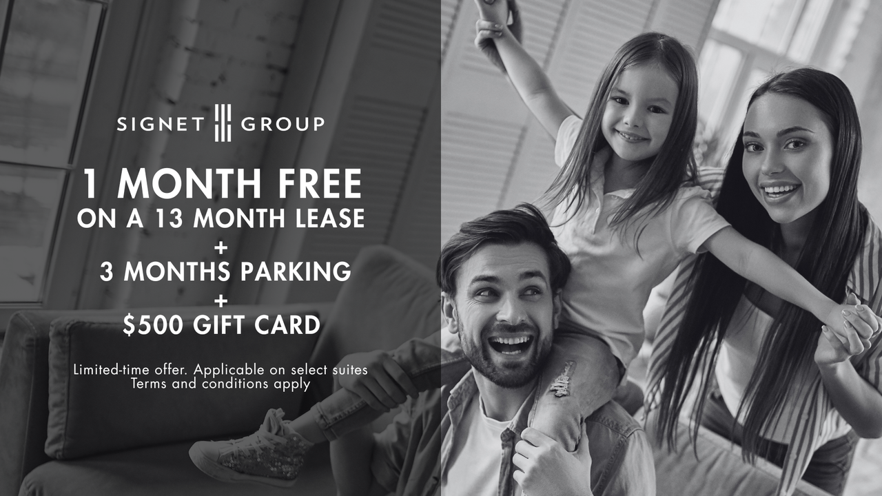 Limited Time Offer: Get 1 Month Free on a 13 Month Lease + 3 Months Free Parking + $500 Gift Card! Applicable on select suites. Terms and conditions apply. Schedule a tour to learn more.
