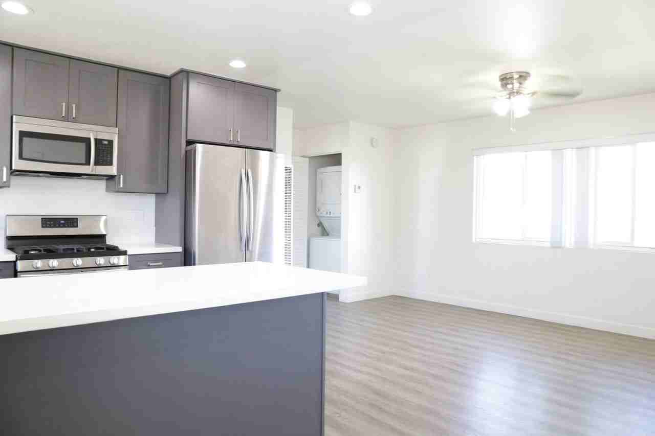 | 2BR/1.0BA | 2 bed | 1 bath | 915 sqft | This is a spacious and bright two-bedroom, one-bathroom upper home on a quiet cul-de-sac street. It features vinyl flooring, stainless steel kitchen appliances, and an in-unit, stackable washer and dryer. The property includes two designated parking spots: one in a shared garage and a second space nearby. | ||