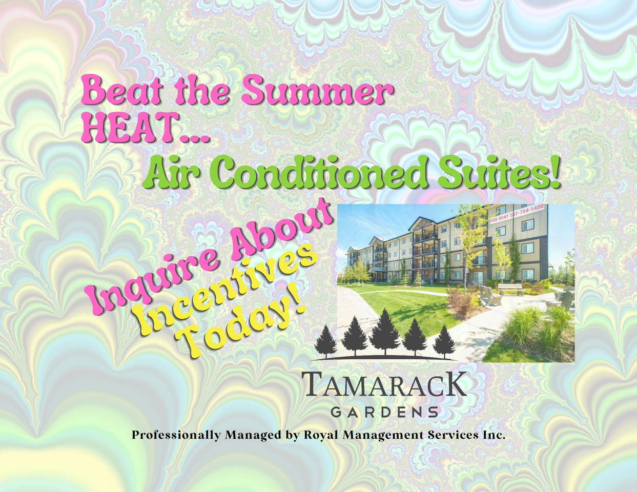 Beat the Summer Heat with Air Conditioned Suites! **Inquire About Incentives Today!** Rent starting at $1,475.00 with 40% OFF ON TELUS INTERNET *offer is valid on a 12 month lease only. [CLICK HERE FOR YOU VIRTUAL TOUR](https youriguide com vTVNH25UBKH2E1 ) Spacious, Air Conditioned 2 bedroom apartments for rent in Edmonton's south-east community of Tamarack. Featuring clean, spacious, and well maintained 2 bedroom suites, our building is both family and pet friendly. Living in Tamarack has never been so luxurious, with ample shopping and activities close by in the Riocan Shopping Centre on 17th Street. Amenities at your fingertips; major retailers such as Walmart, Superstore and Home Depot are all within walking distance. Minutes away from your front door is access to the well know Fulton Lake Marsh Lands, a multi-use and natural trail system. Within close proximity is Blair McPherson K-9 public school and The Meadows Recreation Centre. Accessibility into the Tamarack community is made easy by quick vehicle access to Whitemud Drive and 17th street; as well as frequent bus service at the nearby Meadows Transit Centre. Featuring: - Security Deposit $1475! Additional Discount for Seniors 55+. - In-suite Air Conditioning. - In-suite laundry. - Dishwashers. - Microwaves. - Full size Fridge and Stove. - Window Coverings Included. - Spacious Balcony for every unit. - Heat included in the rent. - 1 energized parking stall included with the rent with additional stalls available for rent. - Pet Friendly! Accepting cats and small dogs. (with applicable fees) - FOB Security, Intercom and Video Surveillance. Tamarack Gardens is also part of the Edmonton Police Services Crime Free Multi-Housing program. For more information, please visit us online at [www.tamarackgardens.ca](https://www.tamarackgardens.ca) Professionally managed by Royal Management Services Inc. (Licensed Broker). Rates, deposits and incentives are based on applicable lease terms, approved credit,and are subject to change without notice (some conditions apply). Photographs are for advertising purposes only and may not be of the actual suite available.