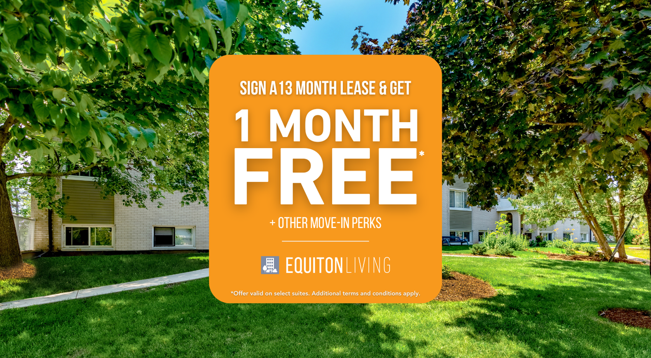 1 MONTH FREE RENT on a 13-month lease, OR a $200 monthly utility credit on a 13-month lease, OR a gift card from everythingcard.ca.* *Offer valid on select suites. Value must not exceed 1 month’s rent value. Additional terms and conditions may apply.