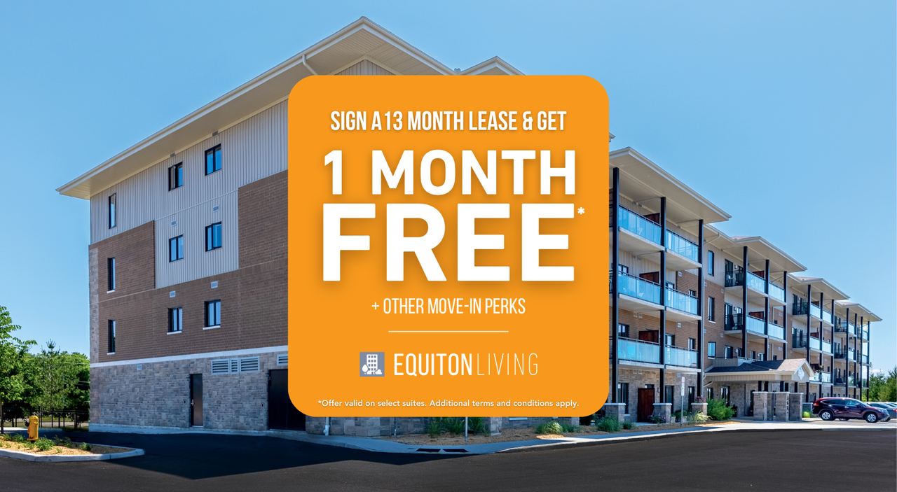 1 MONTH FREE RENT on a 13-month lease, OR a $200 monthly utility credit on a 13-month lease, OR a gift card from everythingcard.ca.* *Offer valid on select suites. Value must not exceed 1 month’s rent value. Additional terms and conditions may apply.