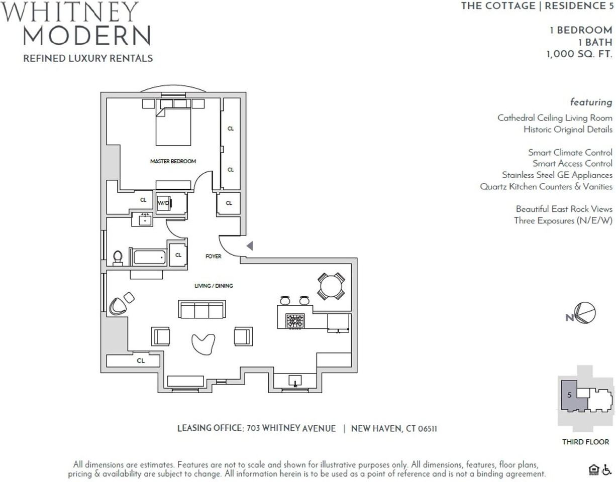 1-bedroom apartments at Whitney Modern cost about 40% more than the average rent price for 1-bedroom apartments in East Rock.
