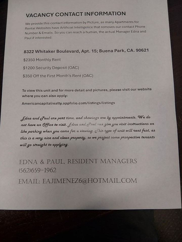 The address for this rental is: 8322 Whitaker Street, Apt. 15; Buena Park, CA. 90621 This is a very nice, clean Property. If interested, email to: **** or you can go straight to Application to the website just below. Phone On-Site Managers Edna &Paul (562)659-1962. If wanting to apply, use our internet website: americancapitalrealty appfolio com listings listings Note: type in the full address and then look for 8322 Whitaker #15. The ad will be turned on and off as we process prospects. Rental Assistant Status: On-Site Manager, Appointment Only, No Office on Property Directions: This unit is located North of the 5 Freeway north of the Mercedes, BMW dealerships, East of Beach Blvd. West of Magnolia. Whitaker runs East to West The unit is nearing completion and ready for showings. The pictures provided are of the actual unit. This Unit is: Apt. 15 Upstairs 2-Bedroom/1-Bath and includes 1-Car Garage. $2350 Monthly $1200 Security Deposit (with OAC) $500 off 1st Month's Rent (OAC) Newer Flooring throughout this unit (wood styled planking and carpeted bedrooms for warmth. Kitchen Modern Appliances: Newer Range, and New Dishwasher. Let us know if you plan to use your own Refrigerator? As we can provide a most basis model. Window Coverings: Vertical Blinds Freshly Painted Freshly Cleaning is scheduled. Bathroom Tub/Shower Surround to be refinished. Laundry: Two small facilities located on the Property. Pay by APP Utilities: Where a tenant is responsible for Utilities or a Service, the tenant has to convert to their own responsibility, upon the day of Move-in. The Tenant pays Gas & Electric The Ownership pays Water, Trash, Landscaping Service. So you know this is our Site, we do have Properties in Arizona, California, Washington, Idaho, and Colorado. Additionally these ads will jointly show on a number of Real Estate Websites, but no not apply thru those individual sites, and only apply through the internet address provided above. We also do not accept anyone else’s Credit Check. We legally have to take the Applications and Process in the order of receipt (paid Fee date for all in a Party or Individual). If we are not getting back to you, we have people ahead of you, or are actively processing Applications. The application processing fee is $40 per adult, applications handled online, includes a $5 Service fee. Each adult interested will have to complete an application. We will only take certified funds for the application processing fee (cashier's check or money order or cash, no personal checks, the suggested online method, will take Credit & Debit cards). Application Processing Fees are not refundable. For each Bedroom in this rental unit, we will accept up to 2 people per bedroom, plus one for the overall rental. A 2-Bedroom, maximum of 5 people. We are looking for Prospects willing and ready to Move-In. Upon an approved application, we will only hold a unit for a pending rental, for 15 Days prior to Commencement, if a full Holding Deposit equivalent to the Security Deposit is tendered. Occasionally based on the State of Preparation, the safety of allowing the public to view, while work is happening, with our Clients Permission, we may extend that, but our normal Company Policy is a 10 day hold. We recommend Online application, but can work with Paper Applications with special arrangements Property Type- 2-Story Super Clean 18-unit Apartment Complex, in a residential neighborhood. Nicely Landscaped. This apartment is..