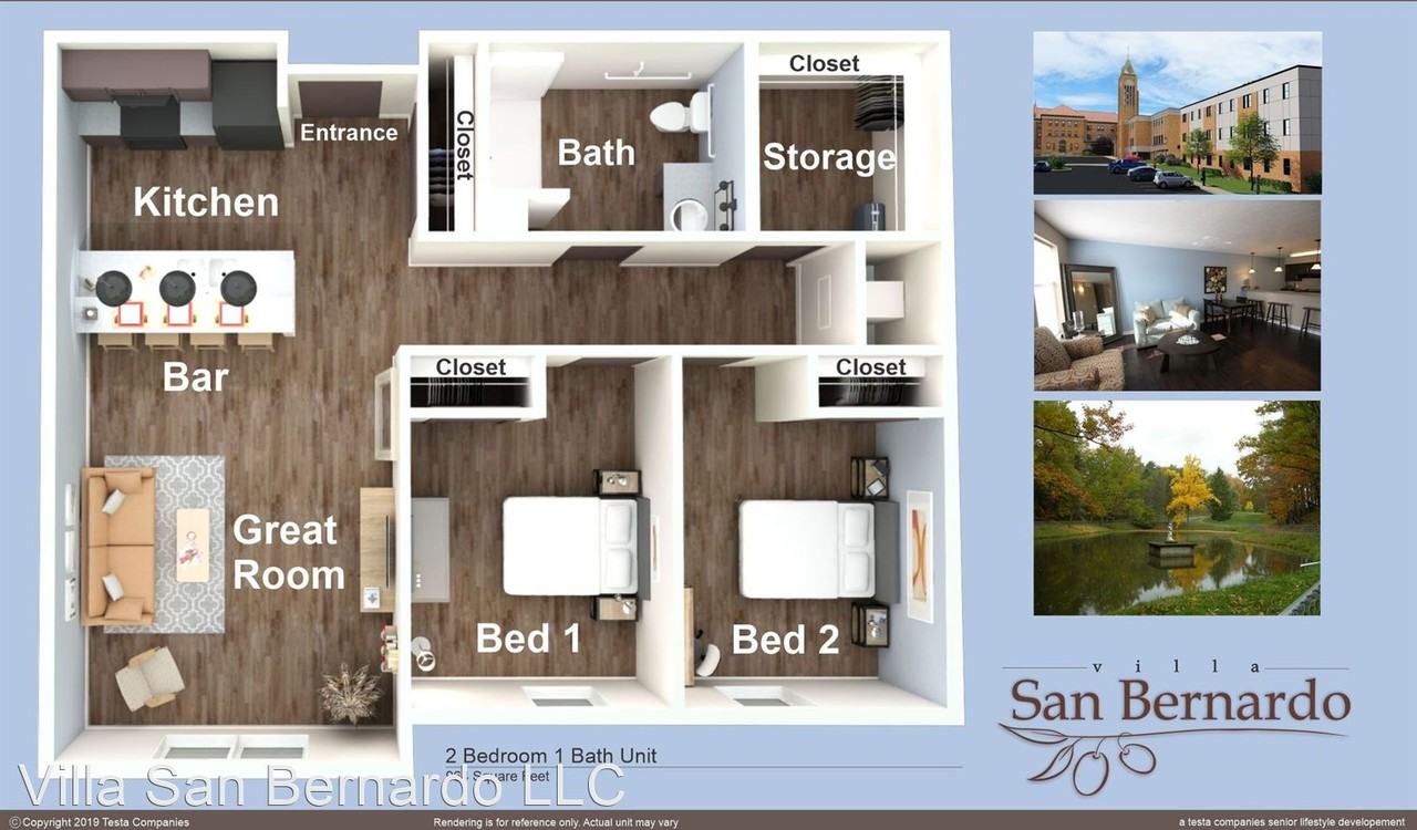 | 1160 Broadway Ave 232 | 2 bed | 1 bath | 976 sqft | 2 Bedroom 1 Bath Senior Apartment - The Villa of San Bernardo is a luxurious yet affordable senior lifestyle community by Testa Companies. This 2 Bedroom 1 Bath unit features an open floorplan with ample space and storage. | ||