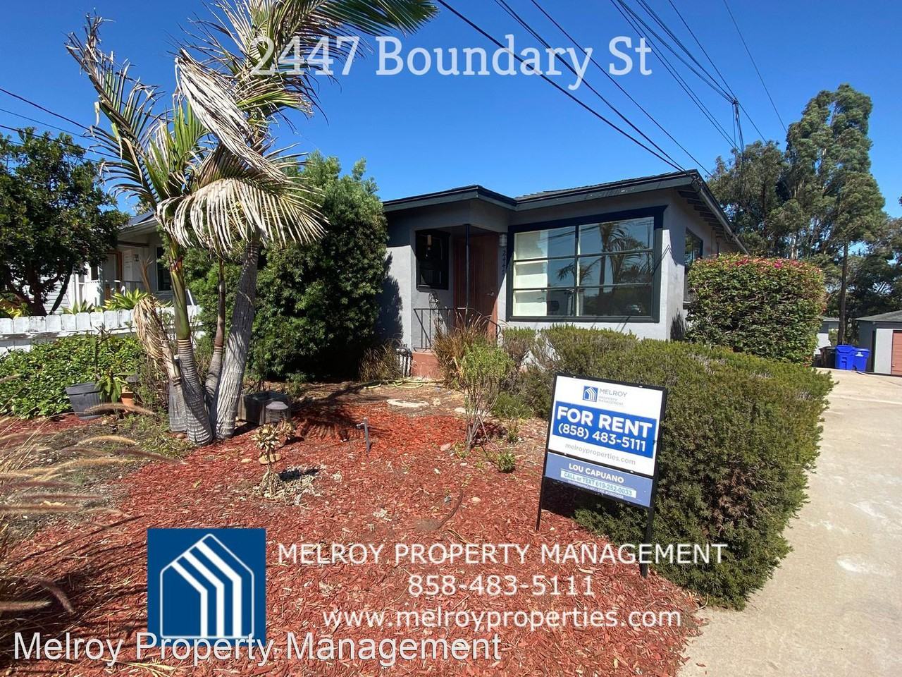 | 2449 Boundary st | 1 bed | 1 bath | 600 sqft | Cute 1 bed Duplex, Bright, Wonderful views, wood floors. ~ 2449 Boundary - AVAILABLE NOW ***************To view this property please******************* Text your first name + 2449 to 619-252-0033 (TEXT ONLY) ~or~ Call Lou at 619-252-0033 (9am - 7pm please) Bright and spacious Cottage in a park like setting! 1 Bedroom 1 bath, 600 square foot home with lots of natural light in the South Park area of San Diego ~South of Maple. The kitchen features San Diego cottage charm with tile counter, gas stove, and extra pantry/mud room. There are classic Hardwood Floors and ceiling fans throughout the unit. The unit comes with a Small private use deck. On the property is Laundry Facilities. Lots of street parking! Close to shopping, transportation, and entertainment. Easy access to the freeways. SORRY NO SMOKING, No Pets. ***************To view this property please******************* Text your first name + 2449 to 619-252-0033 (TEXT ONLY) ~or~ Call Lou at 619-252-0033 (9am - 7pm please) Professionally managed by Melroy Property Management Apply online at www MelroyProperties com Square footage is an approximate amount and the space should be verified by the renter. Holding Deposit required within 24 hours after acceptance. Security deposit is equal to one month on approved credit. Water, Trash, and sewer are included; tenant pays their own other utilities. Owner requires renters insurance. Sorry, NO SMOKING ON PROPERTY. ~~~~~~~~~~~~~~~~~~~~~~~~~~~~~~~~~~~~~~~~~~~~~~~ If you are an owner looking for Management services, Try our full service with no hidden fees and no risk! Call today at 858-483-5112 | ||