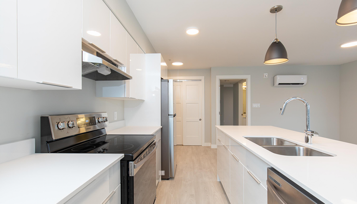 Welcome home to The Shores. This beautiful, bright, modern building is within walking distance to downtown Courtenay, with all the shopping, restaurants, and amenities. Walk out the front door and onto the Riverway Heritage Walking Path. Our spacious one-one+den-two bedroom suites have in-suite washers/dryers, white quartz countertops in the kitchen and bathroom, high gloss white cabinetry, wide plank laminate flooring, and luxury vinyl in the bathroom. All apartments have air conditioning and balconies to enjoy. This building has keyless entry and security surveillance throughout the building and property.