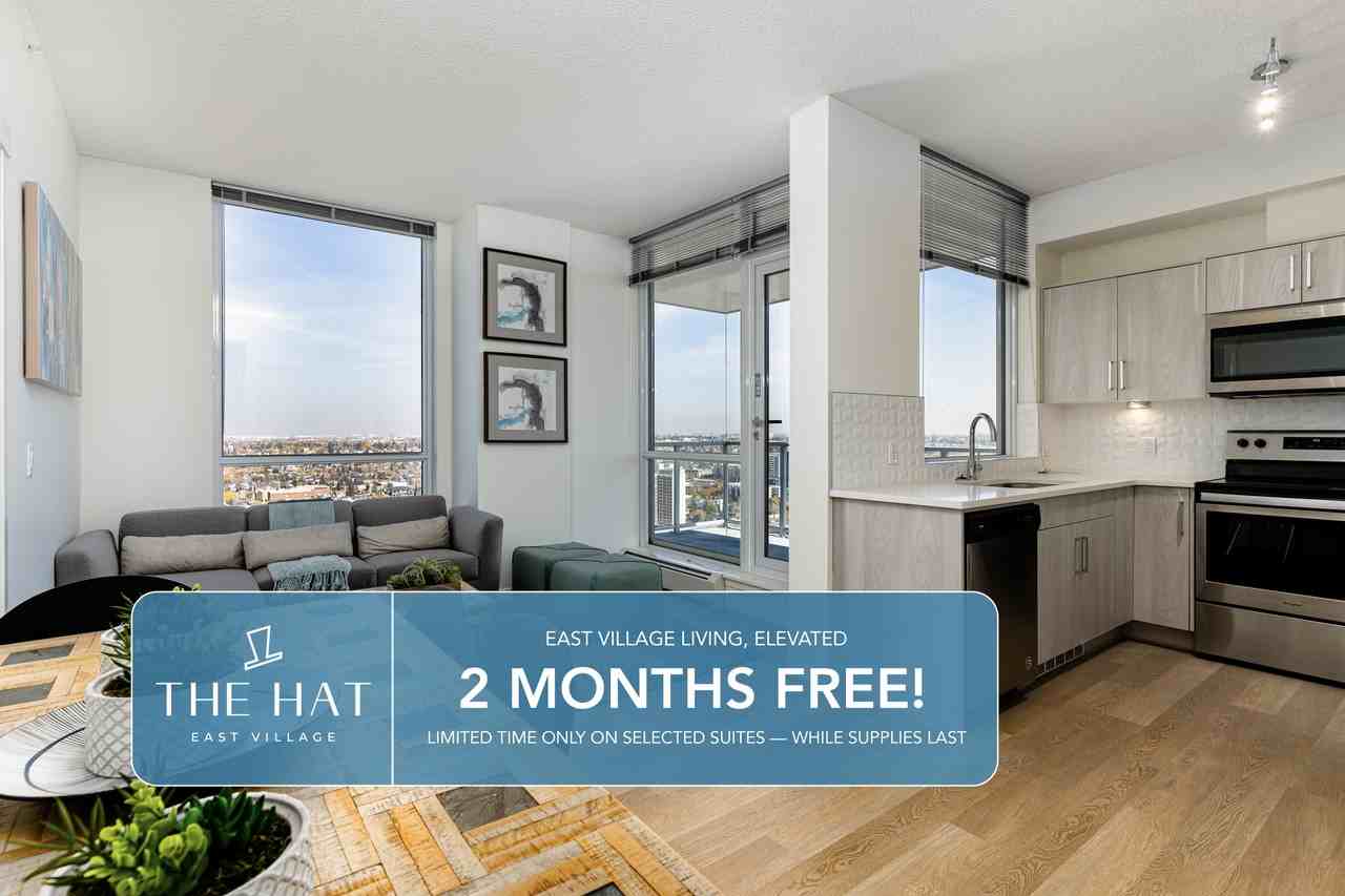 2 MONTHS FREE RENT ON SELECT SUITES FOR A LIMITED TIME JUST IN TIME TO FIND YOUR HAT Now is the perfect time to join The Hat East Village. With spacious studios, and 1, 2 and 3 bedroom suites, there’s plenty to do indoors and out! With a variety of floor plans to choose from, you’re sure to find your perfect hat! Check out our incentives! \_\_\_ Located just steps away from the Bow River and Calgary's downtown core, The Hat at East Village is in the centre of exciting community growth. Blooming arts and culture institutions, exciting retail, dining and entertainment options, are all readily available to you in the trendy, vibrant neighbourhood of East Village. Building Features: Welcome to the very first rental tower in the East Village. Boasting 221 residential units, thoughtful touches extend throughout the entire building for your convenience: - Professionally managed and leased, with staff on site 7 days a week and onsite maintenance - Heated underground parking available for $175 per month - Fully covered loading bay and over-height ceiling elevator allocated for ease in moving in/out - Three high-speed elevators, with enhanced camera security & restricted fob access by floor - Wifi throughout gym/lobby - Secure, heated locker area only accessible by key fob - Indoor heated shared bike parking and outdoor shared bike parking - Cats and dogs allowed (weight limits apply, yearly pet fee for each pet) - Non-smoking building Onsite Amenities: Extensive amenities within the building create a living space that satisfies all of your lifestyle needs: - State-of-the-art, main floor gym - Second floor, communal function room with full kitchen - Rooftop patio with fireplace, bbq area and sundeck - Main floor daycare services - Main floor retail tenants Suite Interiors: Beautifully designed, with function, utility and ease of use in mind: - All units include a balcony with aluminum and glass railing - Open European kitchen concepts including stone countertops, and extended eating bar - Stainless Steel appliances: refrigerator, stove, dishwasher/dryer, built-in microwave and hood fan - Delta faucet fixtures - Undermount double kitchen sink with pull out lever faucet - Designer full size slab backsplash - En suite full size washer/dryer - High end vinyl plank flooring throughout each unit - Barometer heating system ensures comfort to residents throughout the winter - Fan coil unit for air conditioning during summer months - Combination of window wall system throughout suites to allow maximum light penetration and views, combined with curtain wall system for privacy - UV protected, Low-E glazing on windows for energy efficiency and maximum comfort - 9' ceiling throughout - Knock down ceiling texture - Full size deep tubs in en-suites c/w curved curtain rod - Mirrored bypass closet doors - Large full size master bedroom, plus walk in closet with wire shelving - All units wired with basic internet and cable packages **Amenities & Community** Ideal location in the heart of the East Village, a wonderfully vibrant, historic and revitalized community: - Riverwalk and Bow River access/views - Surrounded by bicycle & walking paths - 5 minute walk to City Hall Station, part of the free fare zone on the C-Train line - Fantastic arts & cultural facilities, including Studio Bell & The National Music Centre and the New Central Library - Minutes away from the Stampede Grou..