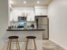 Each residence features an open floor plan that allows natural light to flow through the living areas. Kitchens feature stainless steel appliances, European-style cabinets, and quartz countertops, providing functional space for everyday cooking. Living areas feature durable vinyl flooring and recessed lighting, creating a bright, simple interior design.