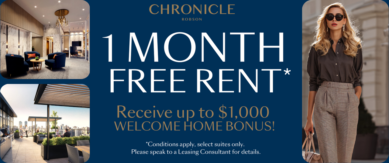 Downtown Vancouver's newest rental high-rise community, on Robson Street. Each residence is thoughtfully crafted and comes unfurnished, pet-friendly, and equipped with Air Conditioning. Key Features (unfurnished) - Pet-friendly - True Air Conditioning - Pet-friendly (Pets subject to some size and weight restrictions. Please contact the Chronicle Leasing Team for more details.) - In-suite Samsung Washer/Dryer - Sea, Park, City Views - Award-winning Service & Management by GWLRA Residential Abundant Amenities - Level 1 - Elegant Lobby Lounge - Study - Co-work meeting room - Level 2 - Outdoor Terrace & Lounge - "The Bark Park" Pet-run - Children’s Play Area - Level 21 - Fitness Facility with 180 Degree Views - Rooftop Clubhouse - Outdoor Skylounge with BBQ & Fire Table - Indoor Kitchen & Dining Room - Movie Lounge - Media & Games Room Please note that all rents listed are starting prices only. Prices subject to change without notice.