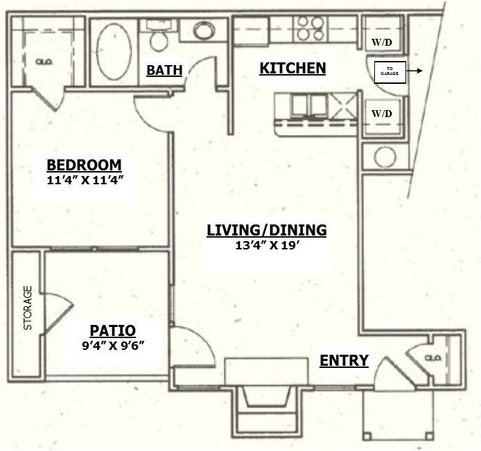 | A4 UPGRADE | 1 bed | 1 bath | 789 sqft | $1,620 /mo | 1 unit available | 1 Bedroom/1 Bath 789 sf Attached Garage Size: 19ft long, 9 ft wide and the height is 6ft 8inches Newly Upgraded!! Must See!! Espresso cabinets, granite counter tops in kitchen and bathrooms, black appliances, modern two-toned paint, new carpet & faux wood vinyl flooring, large kitchen with walk-in pantry, garden tub, attached garage, extra linen storage, fireplace | |