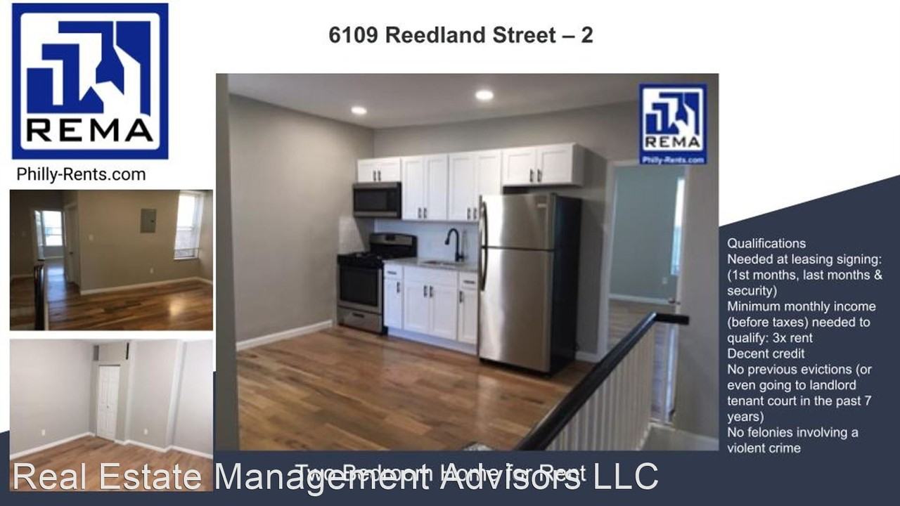 Breathtaking 2 Bedroom Apartment w/ NEW EVERYTHING for Rent - Welcome to 6109 Reedland St. This stunning apartment offers a perfect blend of privacy, modern amenities, and professional management. With its attractive features and convenient location, this rental is sure to meet your needs. Upon entering this spacious apartment, you'll notice that the bedrooms are located on opposite sides, ensuring optimal privacy for you and your roommate or family members. The unit comes equipped with stainless steel appliances, including a microwave, making meal preparation a breeze. The apartment boasts a fresh look with new paint, floors, cabinetry, and a fully renovated bathroom. To qualify for this rental, we require the following: at the time of lease signing, the first month's rent, last month's rent, and a security deposit are needed. Your monthly income (pre-tax) should be at least three times the rent amount. We also require decent credit and no previous evictions or involvement in landlord-tenant court cases within the past seven years. Additionally, we expect no felonies involving violent crimes. Real Estate Management Advisors, LLC - REMA Property Manager Servicing Commercial & Residential Properties in the Philadelphia area. Check out more properties for rent at http www reinfo411 com residential-properties-for-rent Like us on Facebook at https www facebook com REINFO411