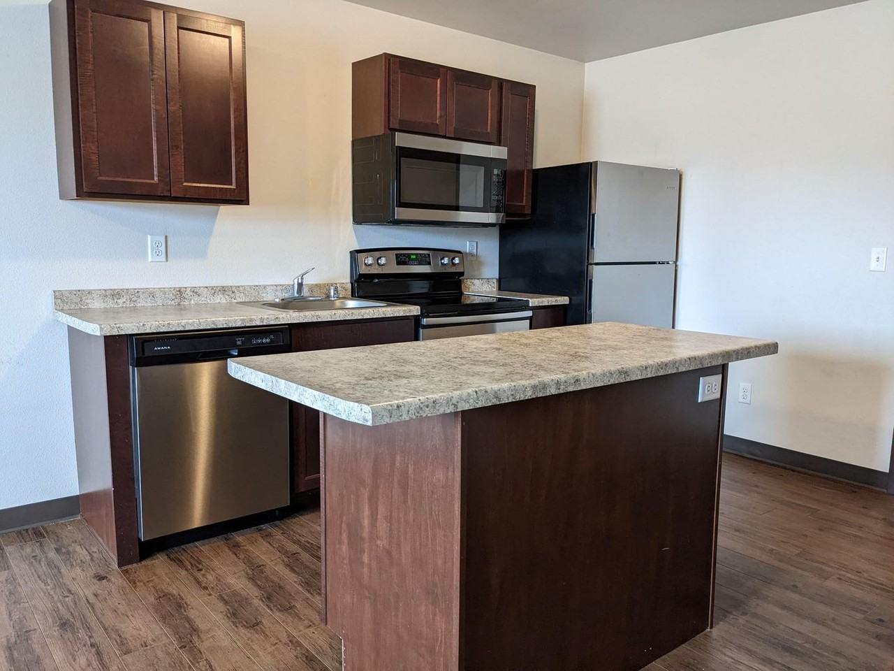 It's a fairly new building and they've already increased the rent & added utility charges. Meanwhile their parking lot remains as an unpaved dirt lot, full of holes, and not graded evenly with the street. Every other new apartment building on the street is paved, has bushes and trees, a proper sign, nicely colored siding w/ stonework, etc, all for a very similar price. While the interior is nice, they put no effort into the exterior. And the odds are high that you will have very unpleasant wall neighbors, cigarette smokers lingering in the parking lot and a marijuana smell in the hallway.