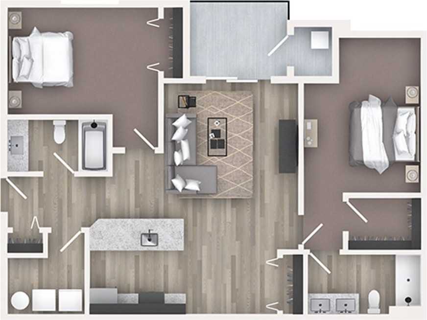 | 2BR/2.0BA | 2 bed | 2 bath | 1,049 sqft | All apartment homes feature granite countertops in both the kitchen and bathrooms, shiny stainless-steel appliances, and their own HVAC system for heating and cooling. Plus, you’ll love the window blinds for privacy! Each apartment also features spacious walk-in laundry rooms. This apartment includes laminate vinyl plank flooring in the common areas, with cozy carpet in the bedroom(s). The 2-bedroom, 2-bathroom layout features both a shower-tub combo and a walk-in shower for added convenance and choice. Conveniently located within walking distance of shops, grocery stores, restaurants, and bike trails. |