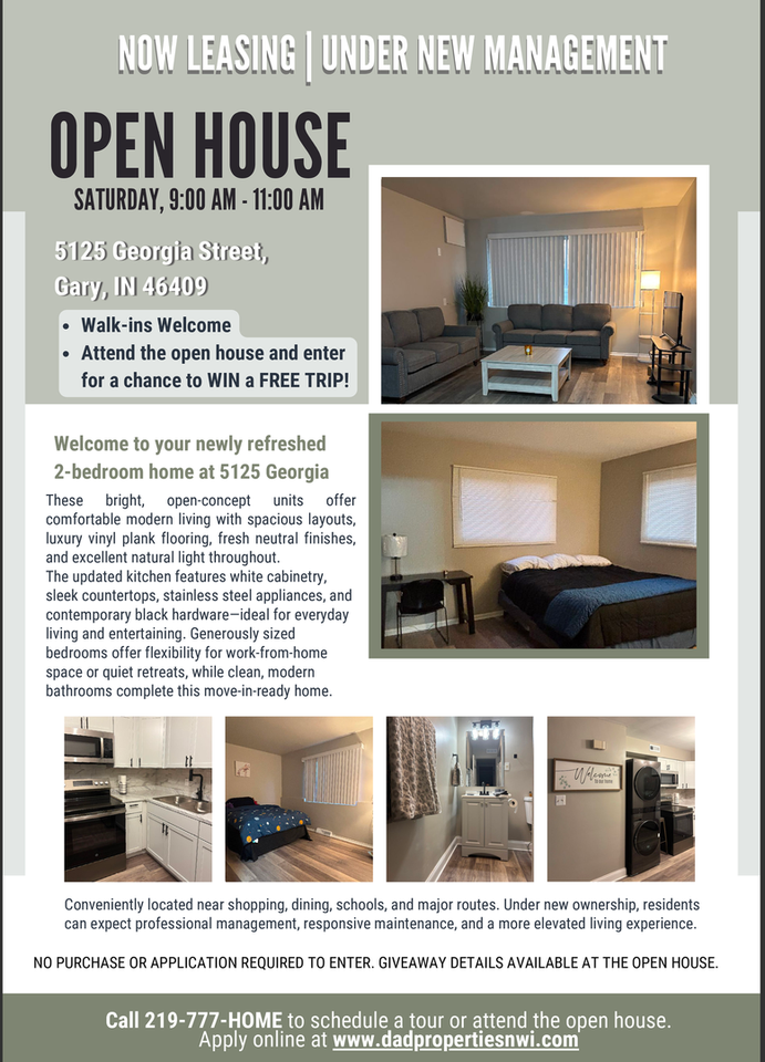 Now Leasing – Under New Management Open House: Saturday (01/24/26), 9:00 AM–11:00 AM 5125 Georgia Street Walk-ins welcome Attend the open house and enter for a chance to win a free trip. Welcome to your newly refreshed 2-bedroom home at 5125 Georgia. These bright, open-concept units offer comfortable modern living with spacious layouts, luxury vinyl plank flooring, fresh neutral finishes, and excellent natural light throughout. The updated kitchen features white cabinetry, sleek countertops, stainless steel appliances, and contemporary black hardware—ideal for everyday living and entertaining. Generously sized bedrooms offer flexibility for work-from-home space or quiet retreats, while clean, modern bathrooms complete this move-in-ready home. Conveniently located near shopping, dining, schools, and major routes. Under new ownership, residents can expect professional management, responsive maintenance, and a more elevated living experience. Call 219-777-HOME to schedule a tour or attend the open house. Apply online at www dadpropertiesnwi com (http www dadpropertiesnwi com ) No purchase or application required to enter. Giveaway details available at the open house.