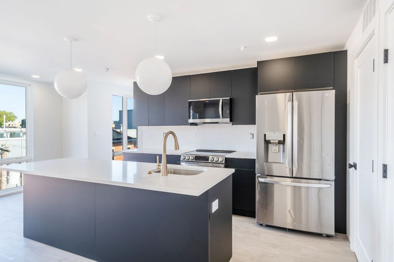 | 1BR/1.0BA | 1 bed | 1 bath | 925 sqft | This modern 1-bedroom apartment offers a blend of style and functionality in the vibrant Fairmount neighborhood. The kitchen features bold black cabinetry with gold hardware, quartz countertops, and stainless steel appliances—perfect for any home chef. Floor-to-ceiling windows provide excellent natural light, complemented by vinyl wood flooring throughout. The bedroom includes an en suite bathroom with a sleek tile shower and glass sliding door. In-unit washer and dryer add everyday convenience. Enjoy building amenities such as a rooftop deck with skyline views, secure keyless entry, and a package room for deliveries. | ||