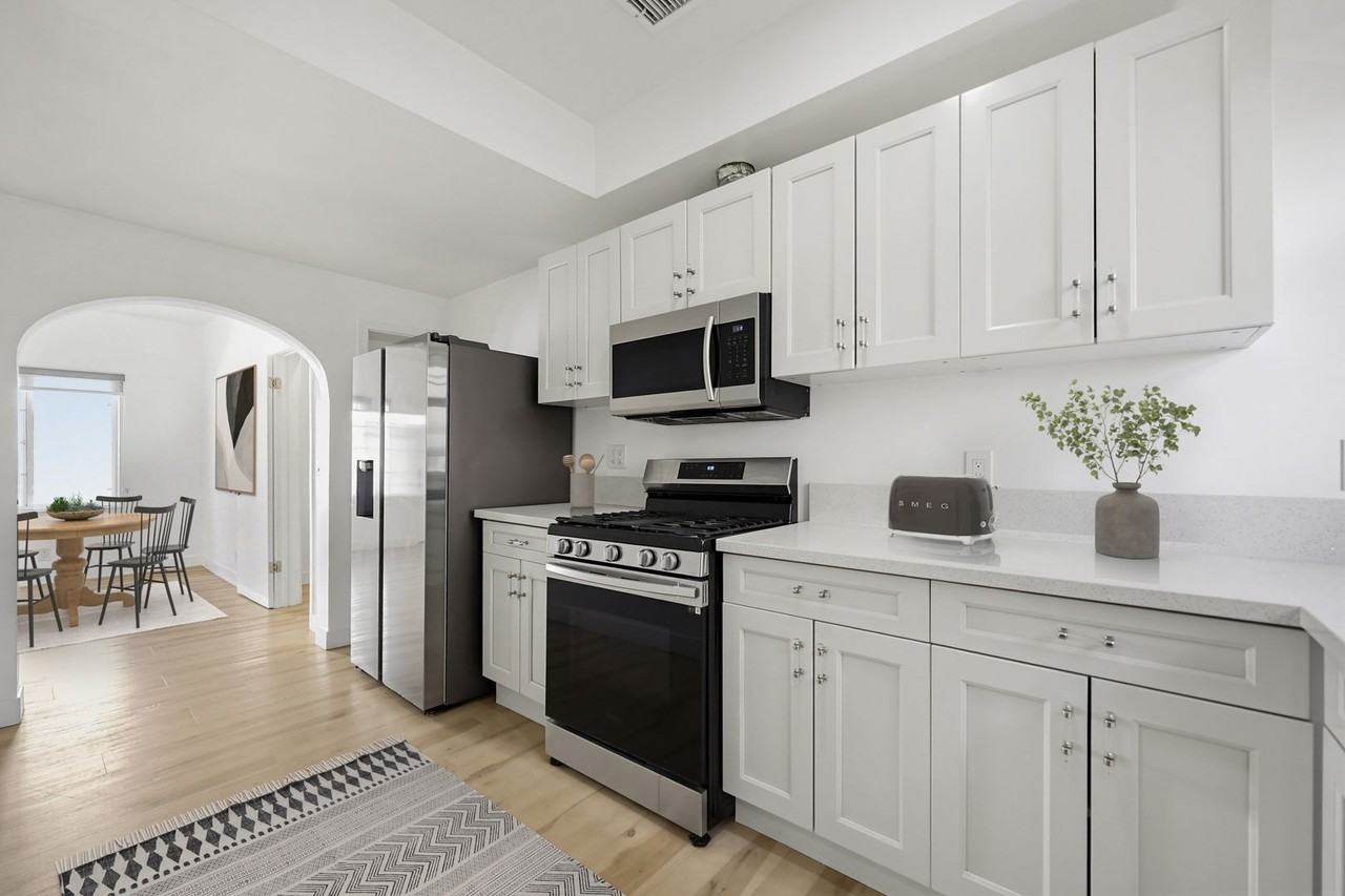 Drake Real Estate Group | Welcome home | Schedule your private viewing | Inspired by Mediterranean and Spanish Revival-style architecture and enhanced by deep red tones and polished wood textures that contrast with stark white walls, these classic restored Santa Barbara-style rental homes are just minutes to thriving Downtown Santa Ana. 1524-1530 North Sycamore Street, located in the heart of Santa Ana’s historic Willard neighborhood, features two side by side, four-unit, two-story low-rise buildings with Santa Barba style architecture. This charming, gated community features a calming water fountain in the courtyard, private entryways, balconies, red tile roofs, and remote-controlled garage parking. Carefully restored and designed by a renowned LA designer, these 1920s vintage luxury rental homes feature keyless entry door locks to spacious one bedroom and two-bedroom floor plans with arched entry ways to newly renovated kitchen and bathrooms. The kitchen boasts sparkling white stone quartz countertops with brand new self-closing cabinetry and high-end Samsung stainless-steel refrigerators with matching gas cooktop with oven and microwave. Stacked washer and dryers included inside each rental home with porcelain tiled bathtubs, and glass shower doors and separate guest bathrooms. Each rental homes also includes central A/C cooling and heating with recessed lights with luxury style remote control blinds and distressed wood plank floors. Minutes off the 5 Freeway on the 17th Street exit and nestled in the historic Willard area of Santa Ana and adjacent to French Park - an area known for its Victorian homes. The community is minutes to Downtown Santa Ana - the rapidly gentrifying area known for its eclectic eateries and elevated dining, fantastic night life, shopping and a host of other activities. 1524 North Sycamore Street has a Walk Score of 90 out of 100.