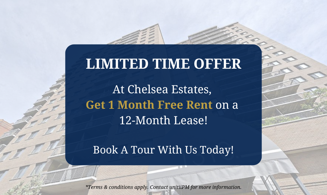 At Chelsea Estates, convenience is key. Enjoy amenities such as underground parking, attentive site staff, and laundry facilities. Stay active in our cutting-edge fitness center and relax in our inviting outdoor lounge area. Plus, we’re proud to be pet-friendly!