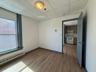 This apartment has been updated with modern finishes, including wood-look laminate flooring in the main living areas and bedroom. The walls are a crisp white, complemented by gray-blue trim on the windows, doors, and baseboards, creating a clean and cohesive look. The space feels bright and open, thanks to the large windows that provide a view of the surrounding downtown area and allow for plenty of natural light. The open-concept living space includes a modern kitchenette with gray cabinetry, a white electric stove, and a full-size stainless steel refrigerator. A closet with a gray door provides storage, while a separate bedroom offers a quiet retreat. The bathroom is an efficient space with a stand-up shower, a small vanity, and a toilet. It also features a window to let in light, along with wire shelving for storage. This property offers a comfortable, updated living experience in a vibrant downtown location. All utilities are included.