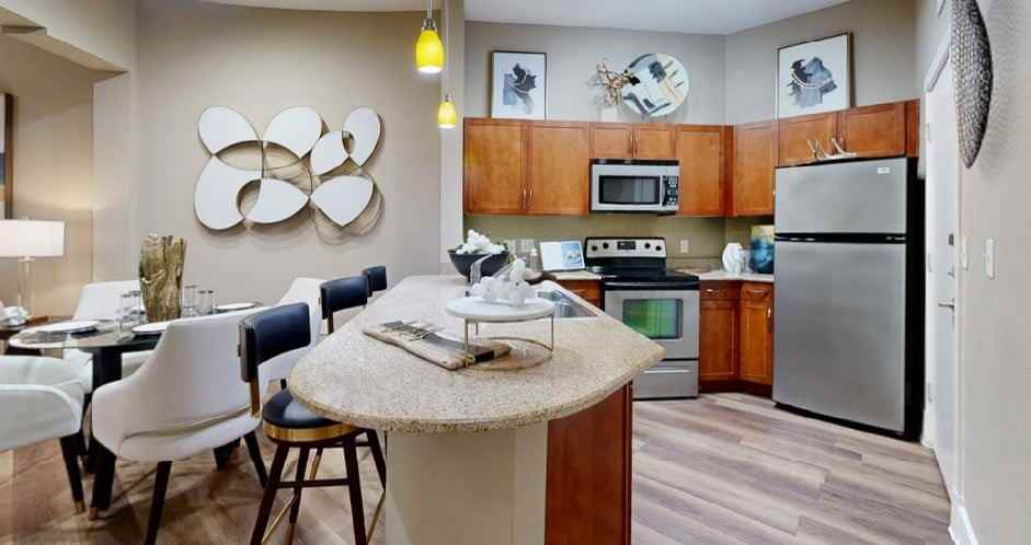 Experience elegance in this memorable one bedroom, that offers an island with breakfast bar, 2 walk-in closets in bedroom, garden tub and walk-in closet in the bathroom. Enjoy the open living, dining and kitchen area complete with pantry, stainless appliances, and granite countertops. A full-size washer/dryer is also included.
