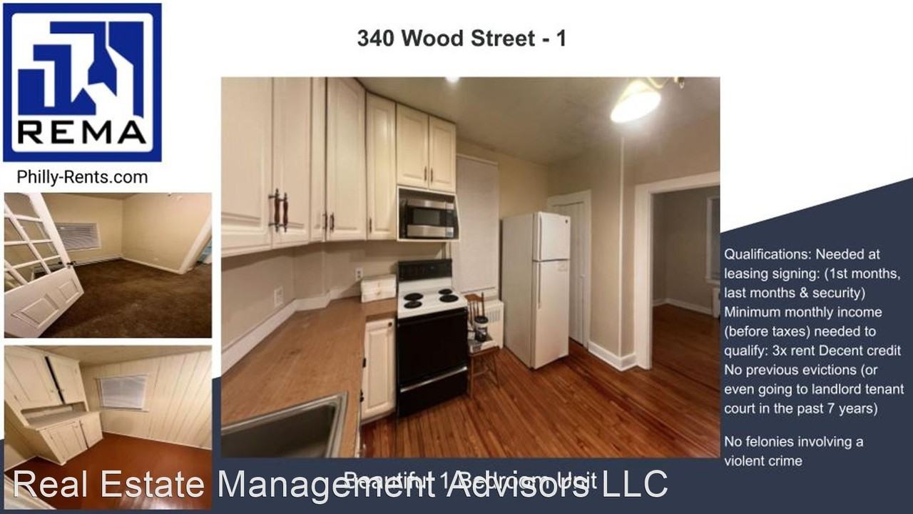 | 340 Wood Street - 1 | 1 bed | 1 bath | Renovated Apartment for Rent in Bristol - Virtual Tour: https my matterport com show ?m=K7PCsRJ9yMM Qualifications: Needed at leasing signing: (1st months, last months & security) Minimum monthly income (before taxes) needed to qualify: 3x rent Decent credit No previous evictions (or even going to landlord tenant court in the past 7 years) No felonies involving a violent crime Real Estate Management Advisors, LLC - REMA Licensed Real Estate Broker Property Manager Servicing Commercial & Residential Properties in the Philadelphia area. Check out more properties for rent at https www reinfo411 com Rentals |