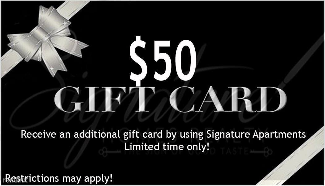 Thank you for trusting us to help you on your apartment search! We will help you look for an apartment that best suits your needs. We have inside specials with our database to offer you the best deals. Please review the list of apartments I created and eliminate the ones you don't care for. Text or email me the ones you like so I can get you the best deal. Remember this is a free service. Kindly register JC Torres with Signature Apartments on your guest card as your referral when you apply. We are also able to help you find a rental home or purchase a home. We want our clients to know they have options. We really appreciate that you trust and use our service. This is our way of granting a treat for you. SIGNATURE APARTMENTS REBATE Receive $50 Gift Card As Our ·12+ month lease term. ·Write JC Torres from Signature Apartments down on the guest card and rental application as your referral source/locator. Sincerely, JC TORRES Signature Apartments Locator 281-616-6686