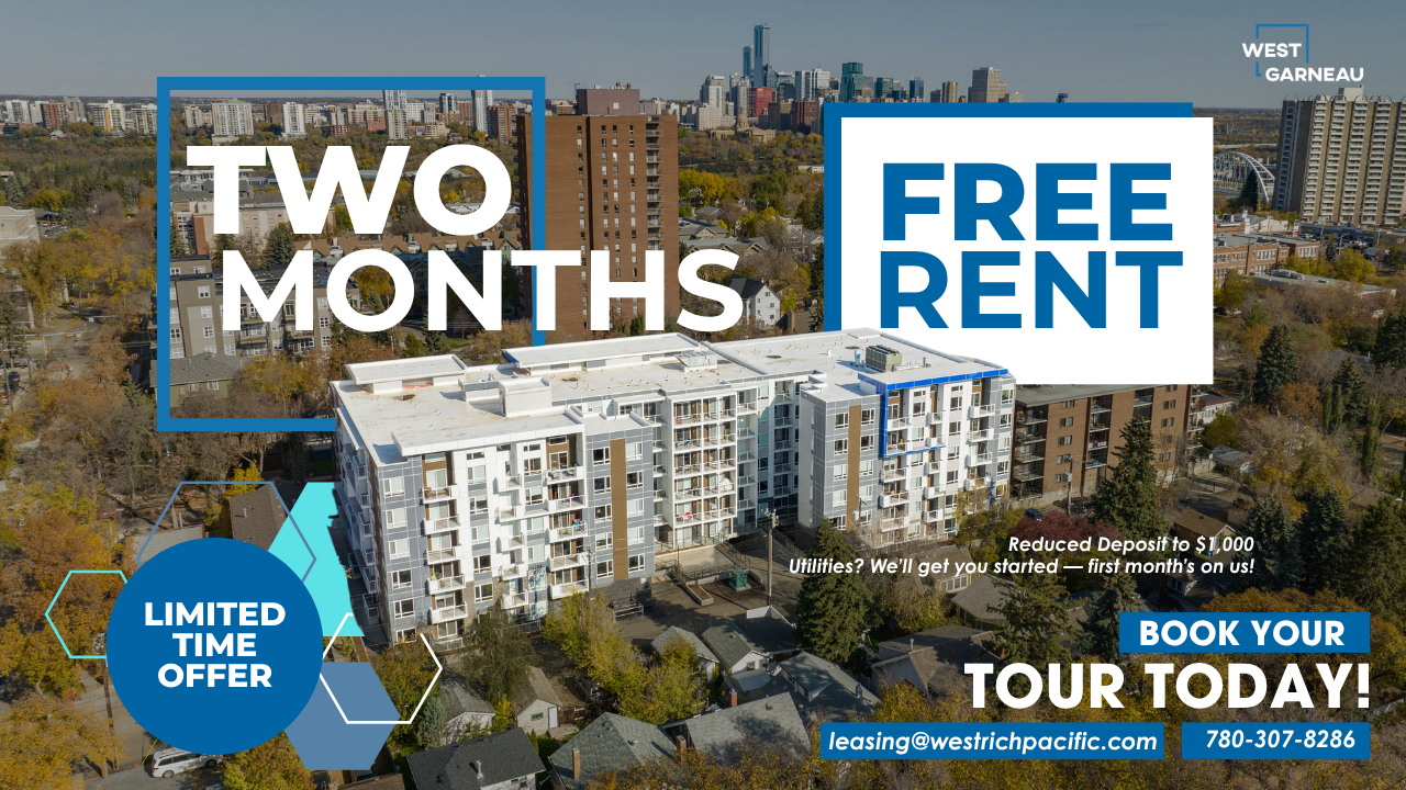 Your New Chapter Begins at West Garneau Limited suites remaining — don’t miss your chance to call West Garneau home! Move in today and enjoy: TWO MONTHS FREE RENT + REDUCED $1,000 DEPOSIT + FIRST MONTH FREE UTILITIES That’s luxury living made easier. Experience Elevated Living Every suite at West Garneau comes with premium upgrades as standard — because you deserve more than the basics. - Smart, functional layouts with plenty of storage - In-suite laundry for ultimate convenience - Air conditioning for year-round comfort - Balconies with bright, oversized windows - Modern finishes and blackout blinds in bedrooms - Full kitchens with stainless-steel appliances - Luxury vinyl & tile flooring — no carpet, no fuss Building Features That Matter Designed with your lifestyle in mind: - Underground heated parking (+ storage lockers) - Secure bike storage - High-speed elevators - Fitness Centre & Resident Lounge - Beautiful courtyard for relaxing outdoors - Monitored security cameras for peace of mind - Pet friendly (ask for details!) Service You Can Count On We believe in community, comfort, and care. - On-site leasing & management team - On-site maintenance for quick assistance - Secure parcel lockers for easy deliveries Book your private showing today! Email, text, or reply to this ad — your new home is waiting. West Garneau Leasing Team 11041 86 Avenue, Edmonton, AB T6G 2B8 Phone number: 780-307-8286 Website: [westgarneau.com](https://westgarneau.com) Email: ****