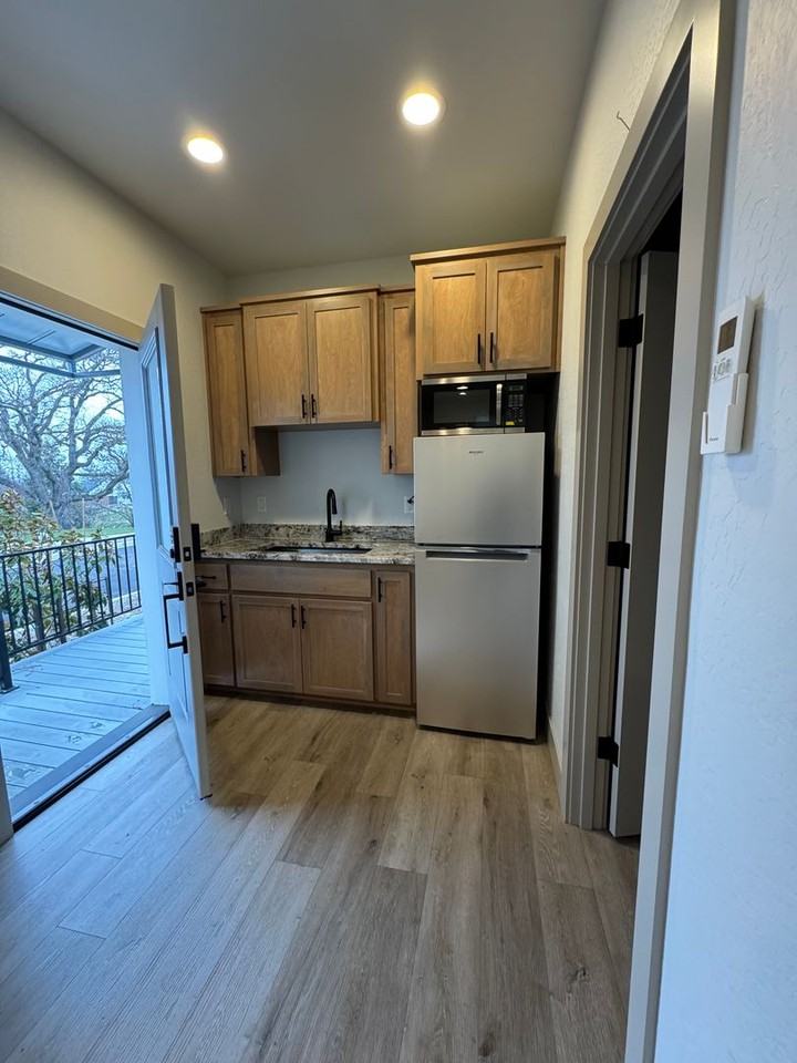 166 N. Mountain unit A is a one studio with hi-tech electronic locks with a shared living space that includes weekly cleaning of the common areas. The vision behind The Cottages and Studios at Beach Creek is to offer quality housing that is attainable, livable, and sustainable. The property consists of a large home divided into separate studios. The studios are designed for individual living. Each is equipped with its own murphy bed, bathroom, kitchenette, washer and dryer. Each Studio and ADU has its own private patio and exterior entrance. The studios connect to a bright and airy hallway that runs front door to the common kitchen. The kitchen is equipped with a refrigerator, oven/range, dishwasher, disposal and dining nook. The entry is framed by large farmhouse style porch. In addition, there is large courtyard and community garden for outdoor gathering. Each studio and ADU is secured with its own electronic lock. All utilities are included. This includes fiber internet. The Cottages and Studios at Beach Creek were built with muti-modal transportation access in mind. Multimodal transportation includes shared transportation, public transportation, rail, bicycle and pedestrian. Multimodal access supports the needs of all users whether they choose to walk, share a ride, bike, use transit or drive.